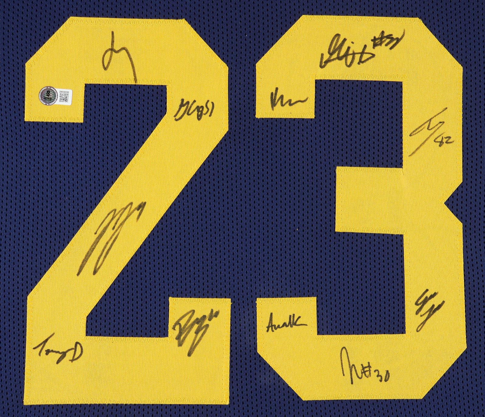 2023 National Champions Michigan Wolverines Custom Framed Jersey Display Signed by (11) with J. J. McCarthy, Tommy Doman, Greg Crippen, Zeke Berry (Beckett)
