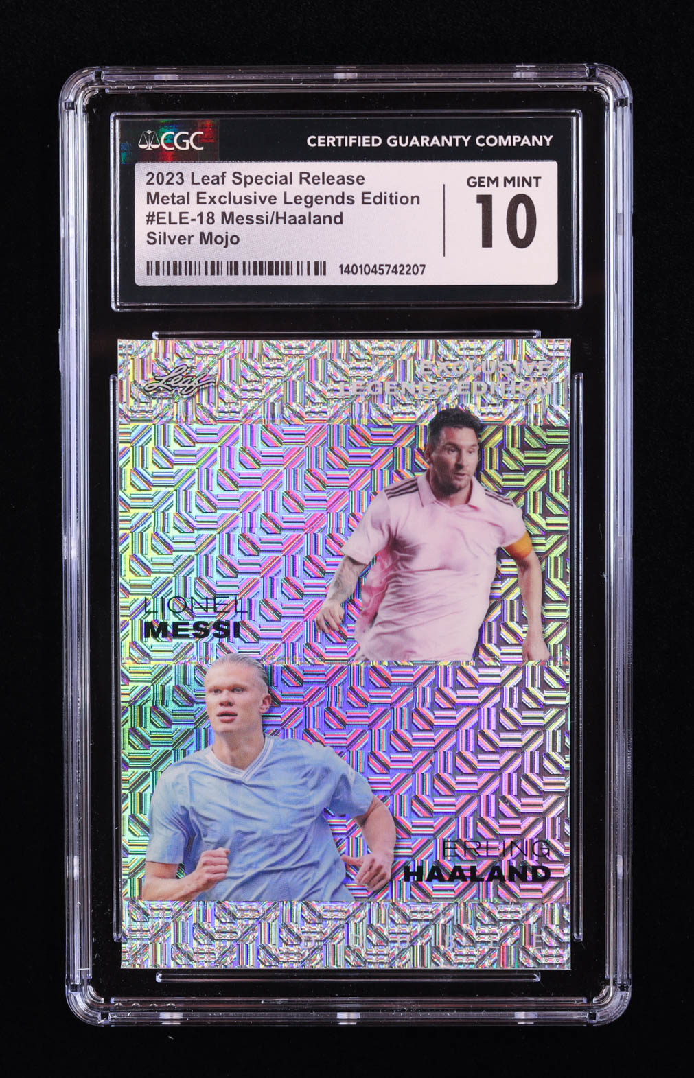 Lionel Messi / Erling Haaland 2023 Leaf Metal Special Release Exclusive Legends Edition Mojo Silver #ELE18 #14/25 (CGC 10)