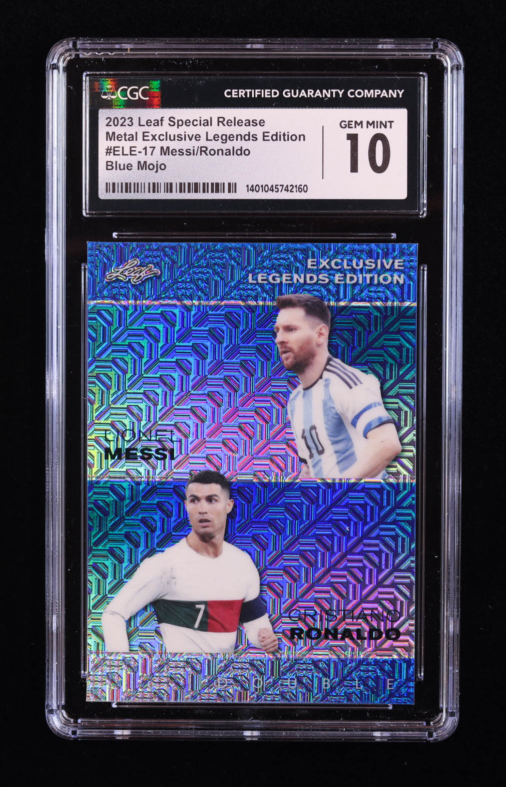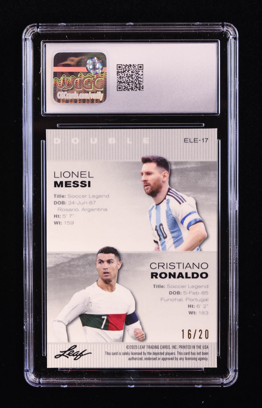 Lionel Messi / Cristiano Ronaldo 2023 Leaf Metal Special Release Exclusive Legends Edition Mojo Blue #ELE17 #16/20 (CGC 10)