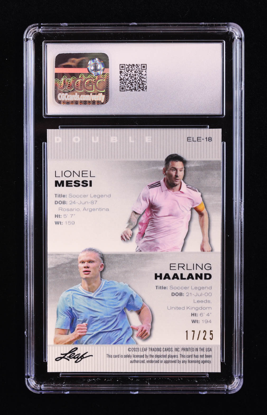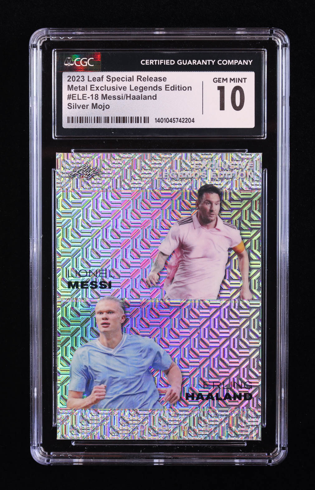 Lionel Messi / Erling Haaland 2023 Leaf Metal Special Release Exclusive Legends Edition Mojo Silver #ELE18 #17/25 (CGC 10)