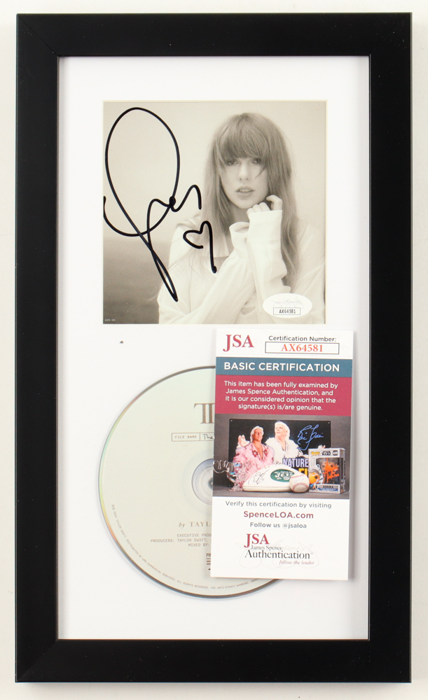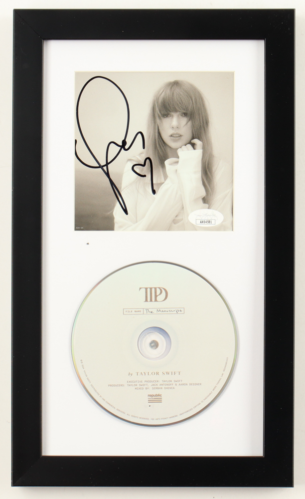 Custom frame measures approximately 8" x 13.25" in size. Features a "The Torture Poets Department" CD insert that has been hand-signed by Taylor Swift. The display also includes the disc as shown.