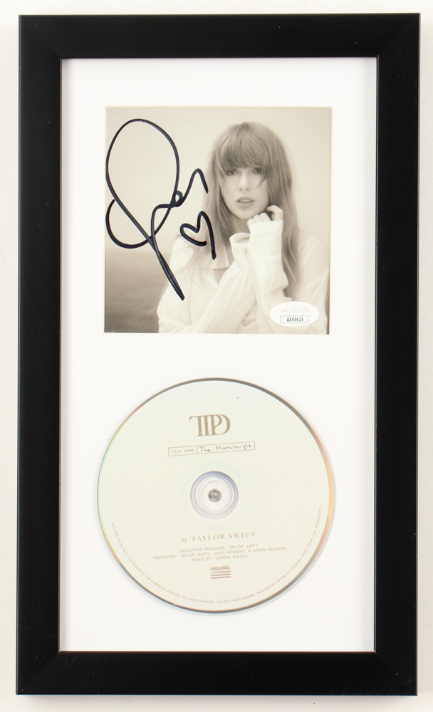 Custom frame measures approximately 8" x 13.25" in size. Features a "The Torture Poets Department" CD insert that has been hand-signed by Taylor Swift. The display also includes the disc as shown.