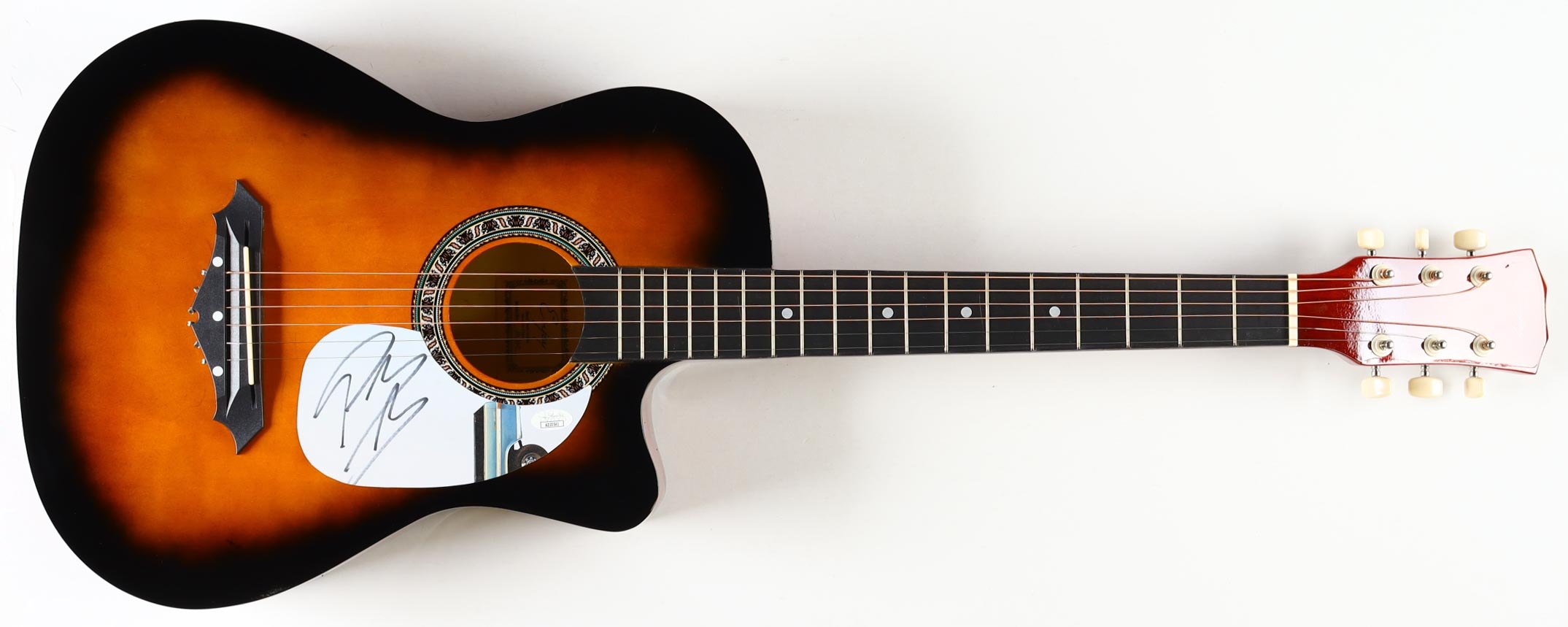 Acoustic guitar measures approximately 38" in length and has been hand-signed on a CD cover repurposed as a pickguard by Post Malone.