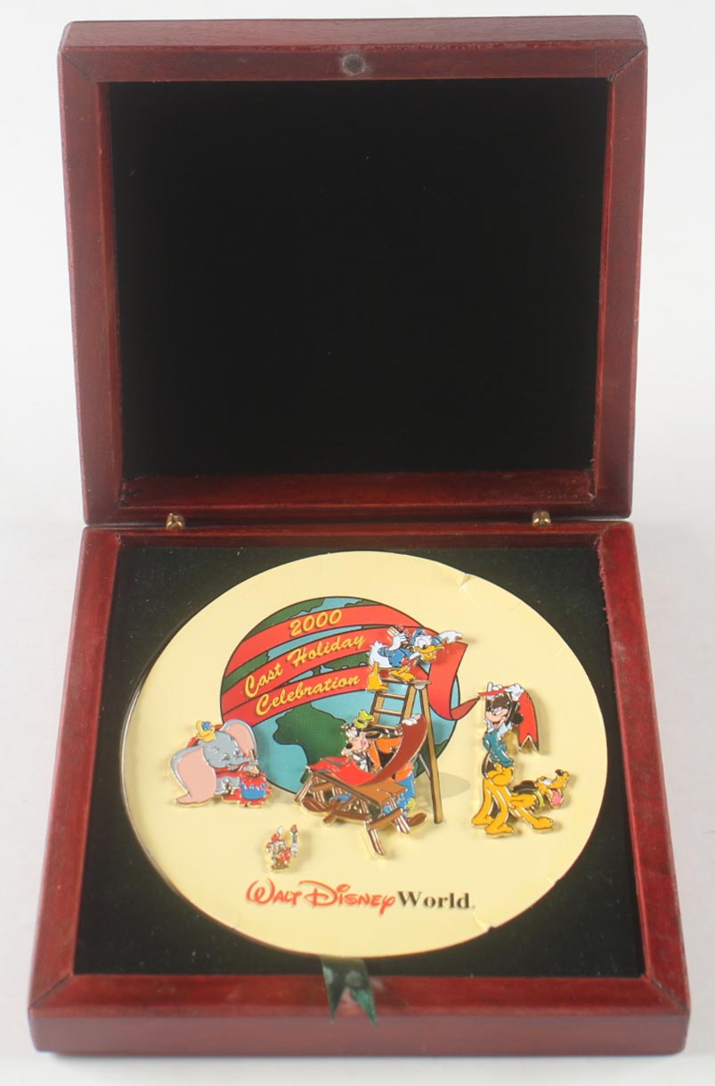 Walt Disney World 2000 Cast Holiday Celebration set of (5) pins, with Mickey Mouse, Pluto, Donald Duck, Goofy, Dumbo, and Timothy Q. Mouse. Wooden box display case is included, as shown.