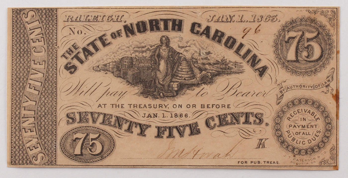 1863 ¢75 Seventy-Five Cent State of North Carolina, Raleigh Bank Note