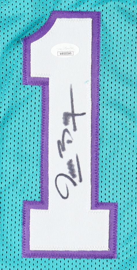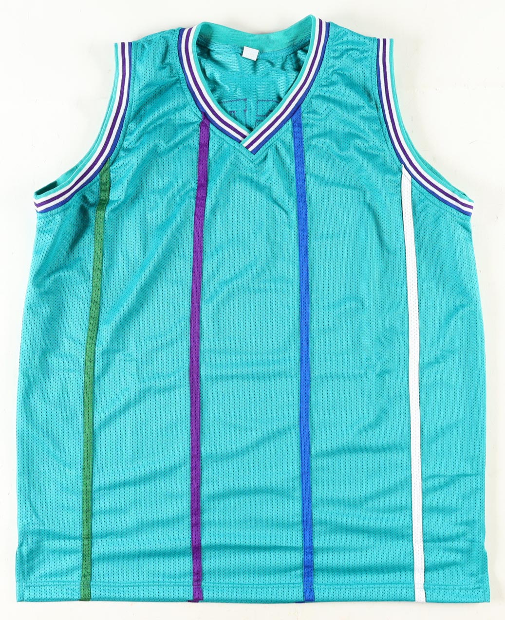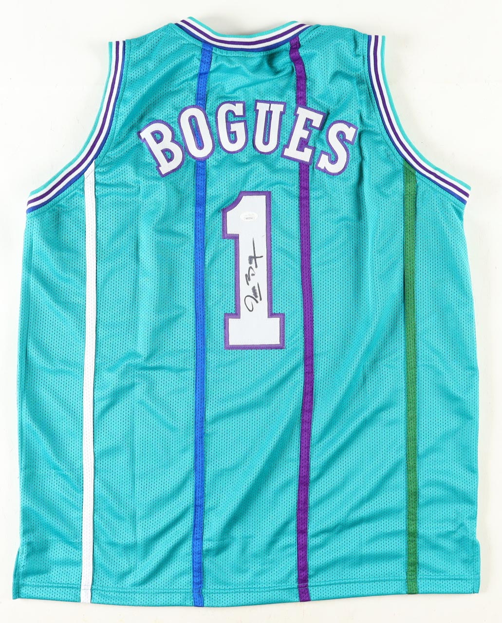 Custom jersey with everything sewn on, size XL. Hand-signed by Muggsy Bogues.