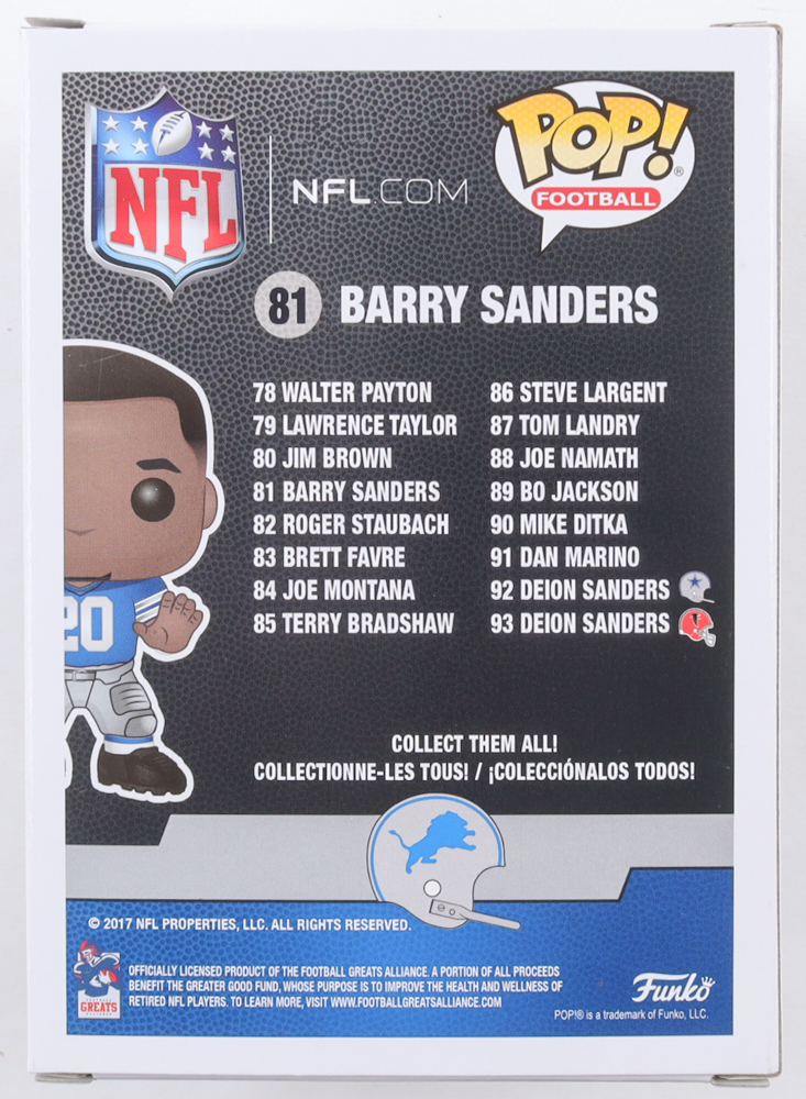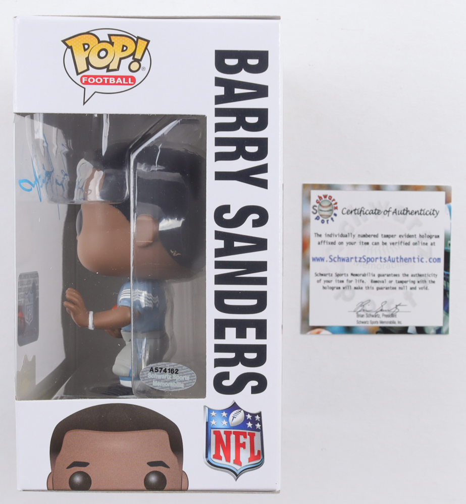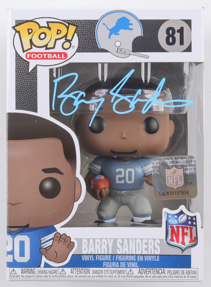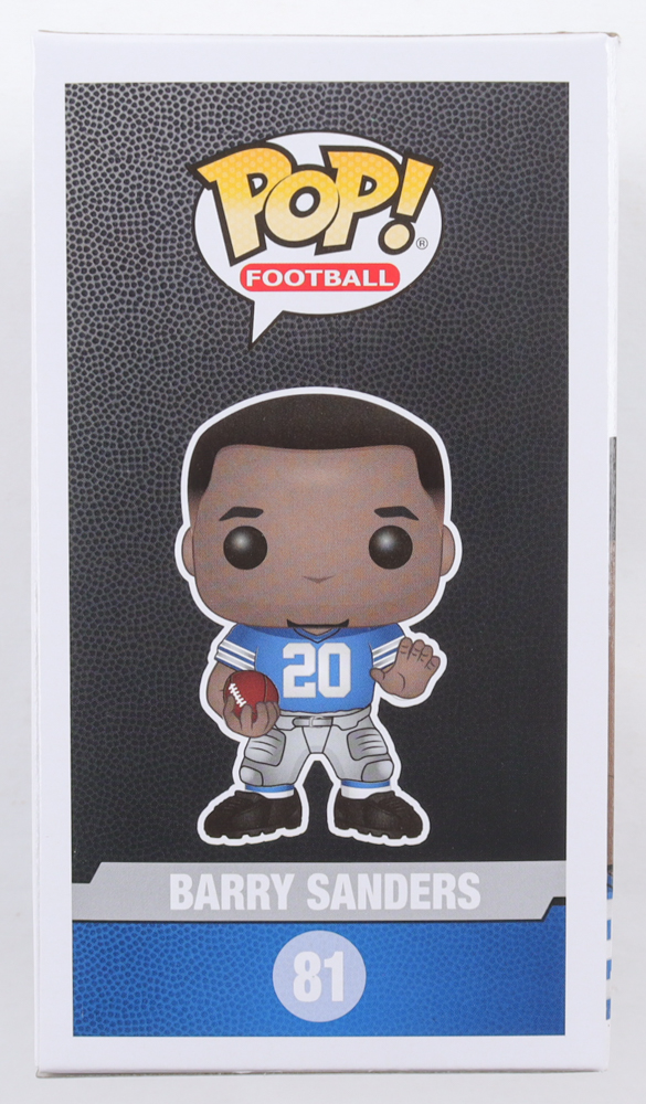 Funko Pop! vinyl figure measures 4" in height. Hand-signed on the packaging by Barry Sanders (Detroit Lions, HOF).