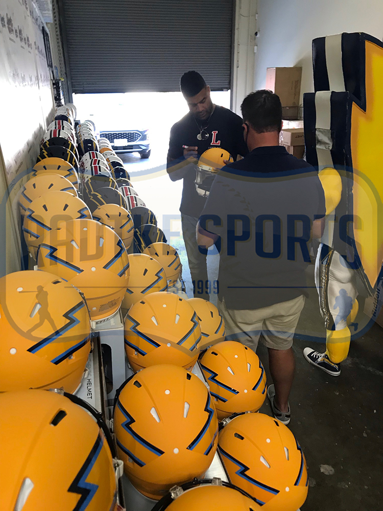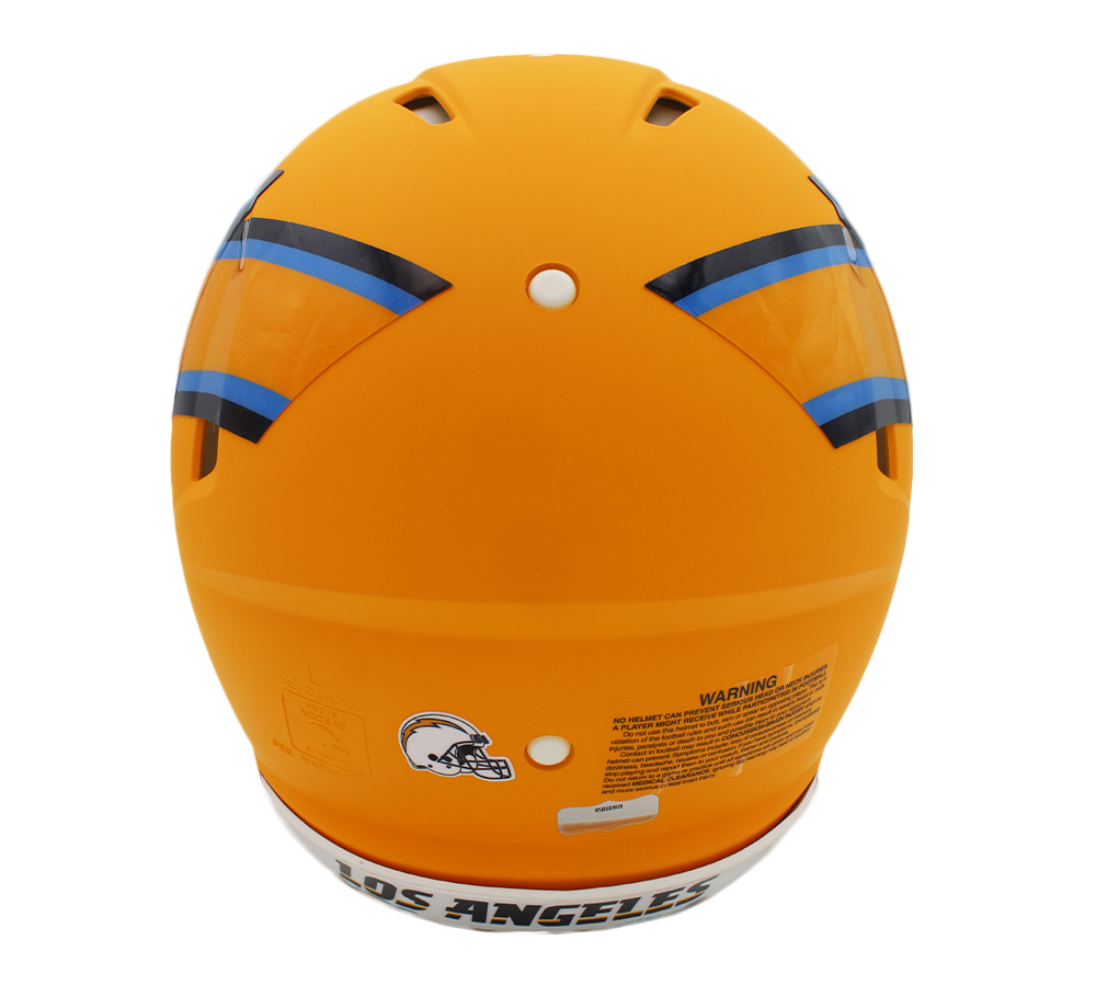 Riddell Los Angeles Chargers full-size AMP Alternate authentic on-field speed helmet has been hand-signed by Shawne Merriman.