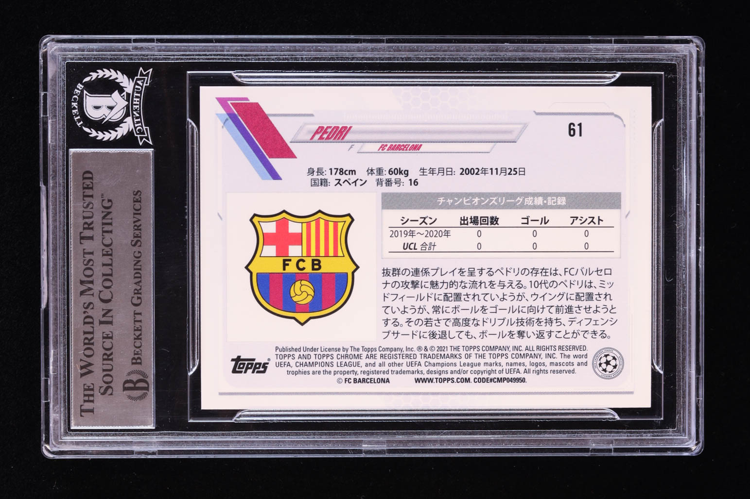 Pedri Signed 2020-21 Topps UEFA Champions League Japan #61 (BGS)
