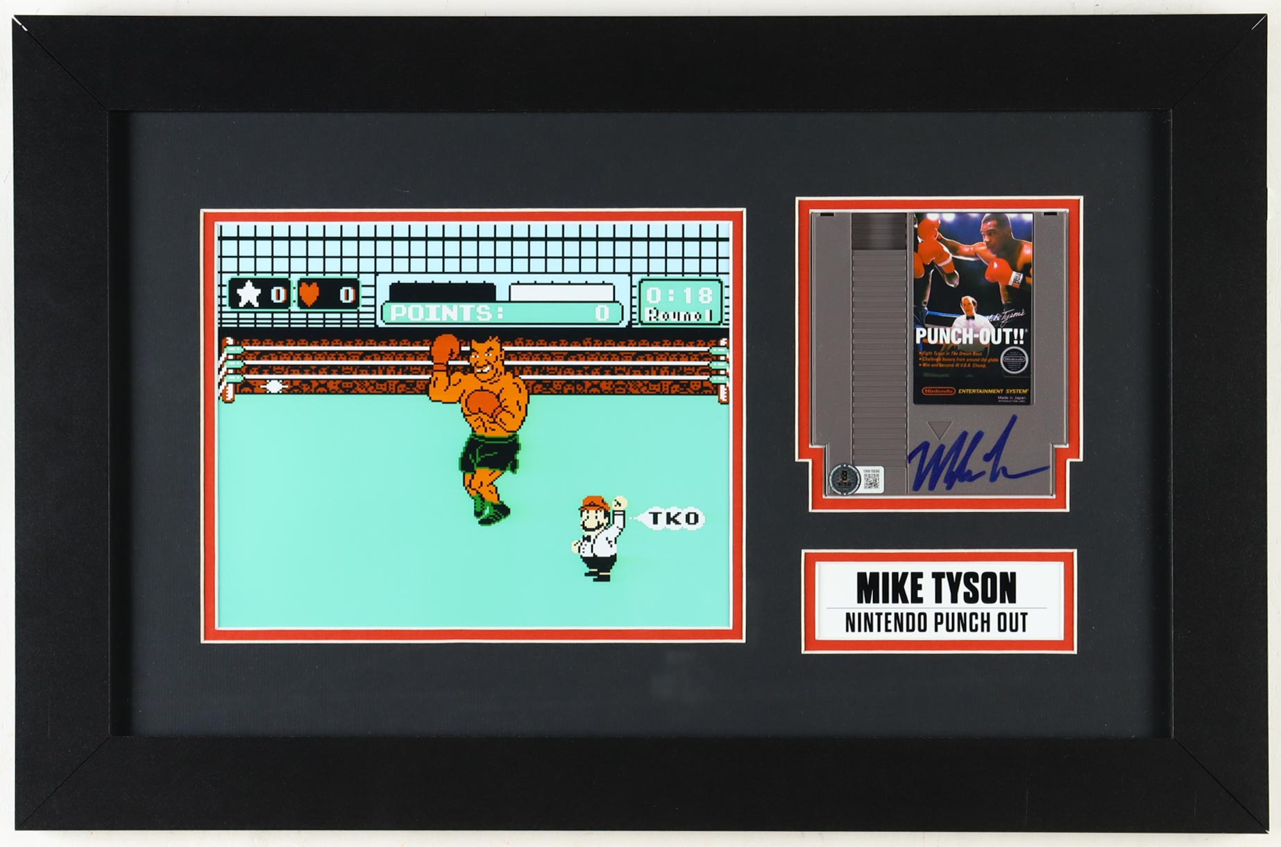 Custom frame measures approximately 15" x 23" in size and and features a "Punch-Out!!" Nintendo game cartridge that has been hand-signed by Mike Tyson (HOF).