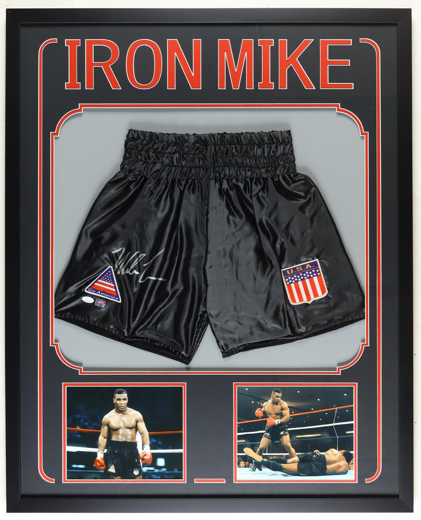 Custom framed display measures 32" x 42" in size and features boxing trunks that have been hand-signed by Mike Tyson (HOF).