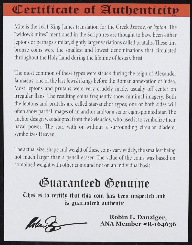 This coin is not a replica, but an actual bronze coin, certified genuine, minted in the Holy Land over 2,000 years ago, during the reign of King Alexander Jannaeus in the century preceding the birth of Jesus.