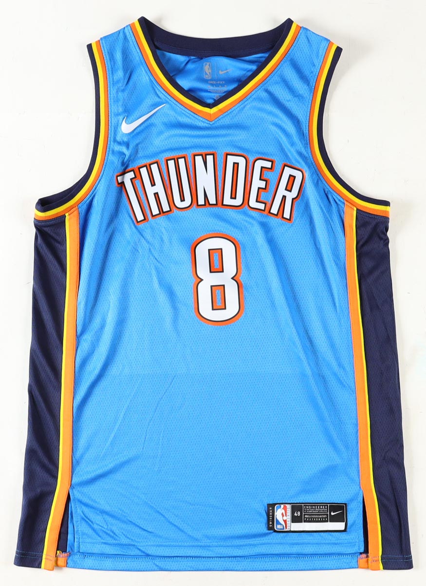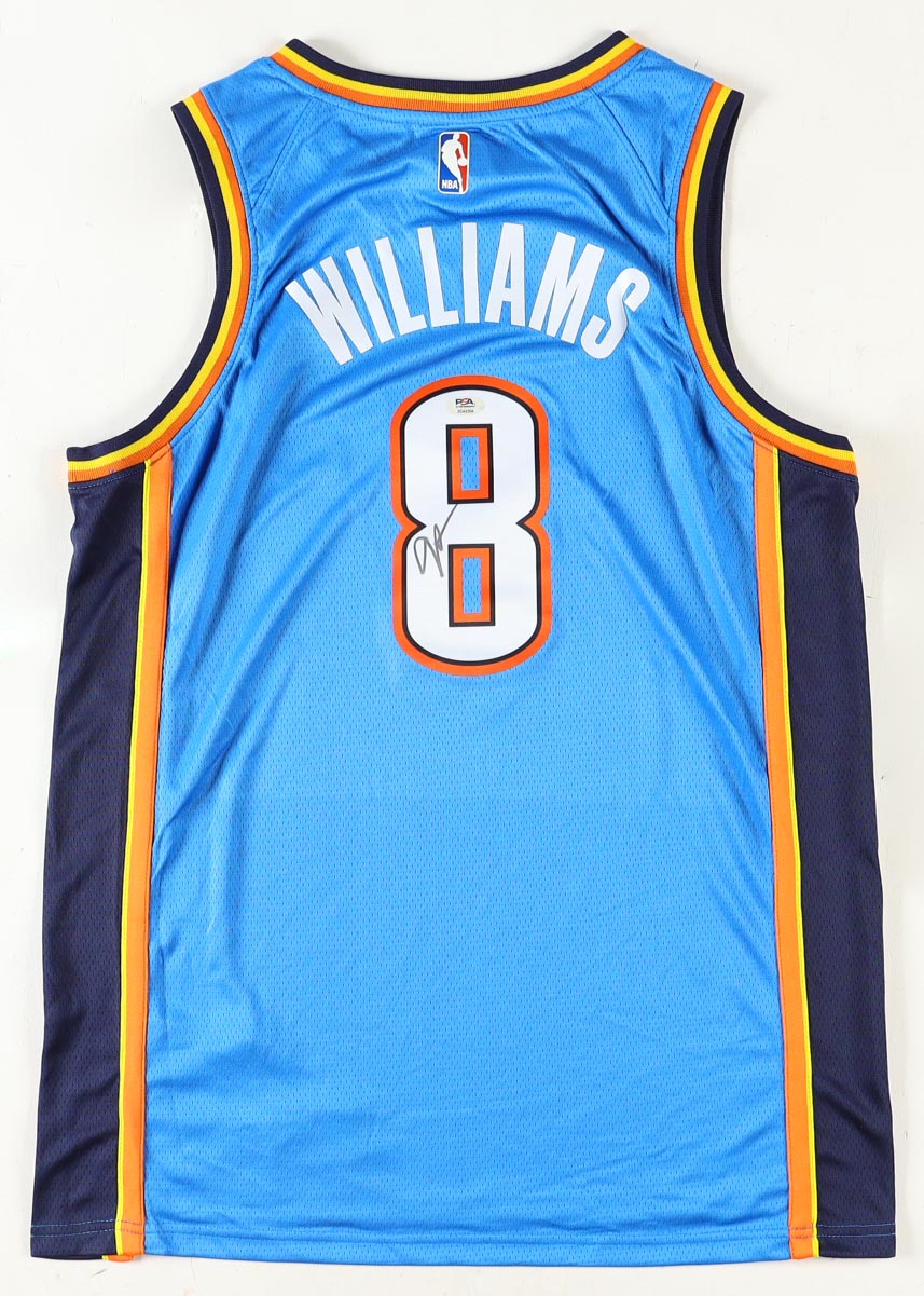 Nike jersey with everything pressed on, size 48. Jersey has been hand-signed by Jalen Williams.