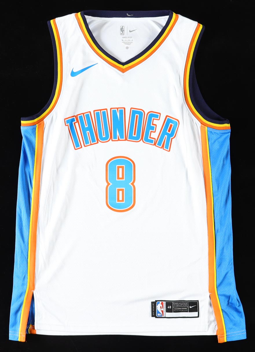 Nike jersey with everything pressed on, size 48. Jersey has been hand-signed by Jalen Williams.