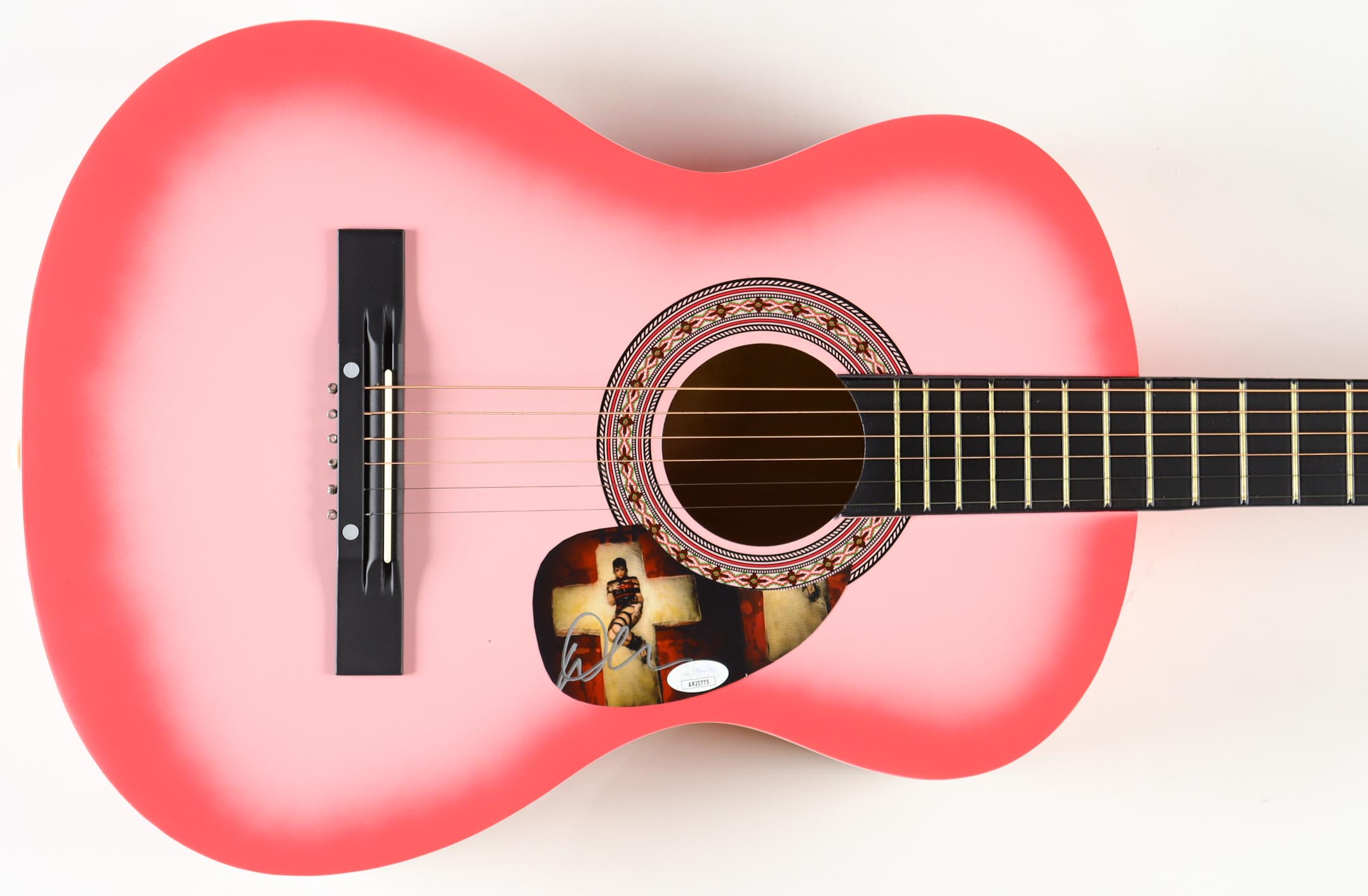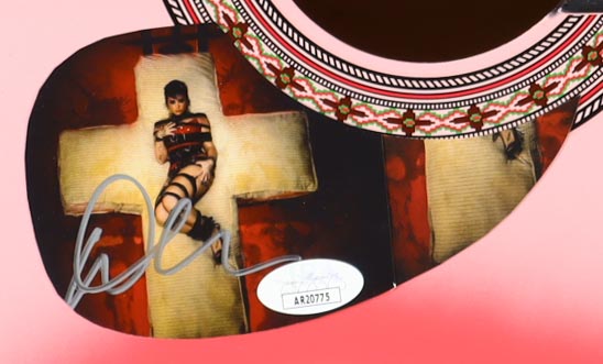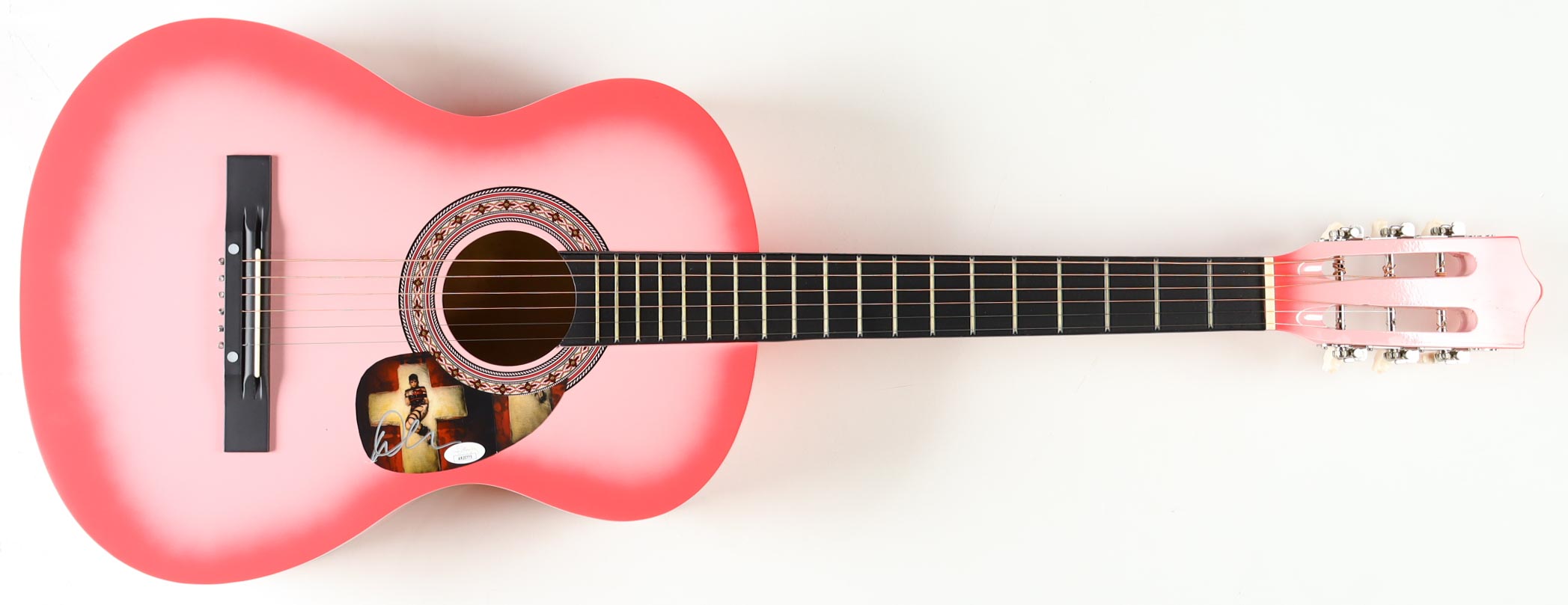 Acoustic guitar measures approximately 38" in length and has been hand-signed on a cut that has been repurposed as a pickguard by Demi Lovato.
