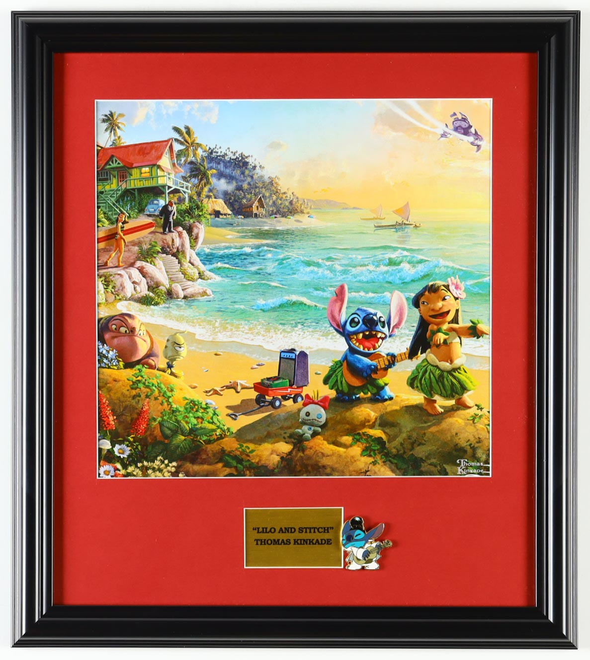 Custom frame measures approximately 16" x 18" in size and features a print of "Lilo & Stitch" by Thomas Kinkade (D. 2012). Display also features a Disney Stitch Pin. Please note, the display is unsigned.