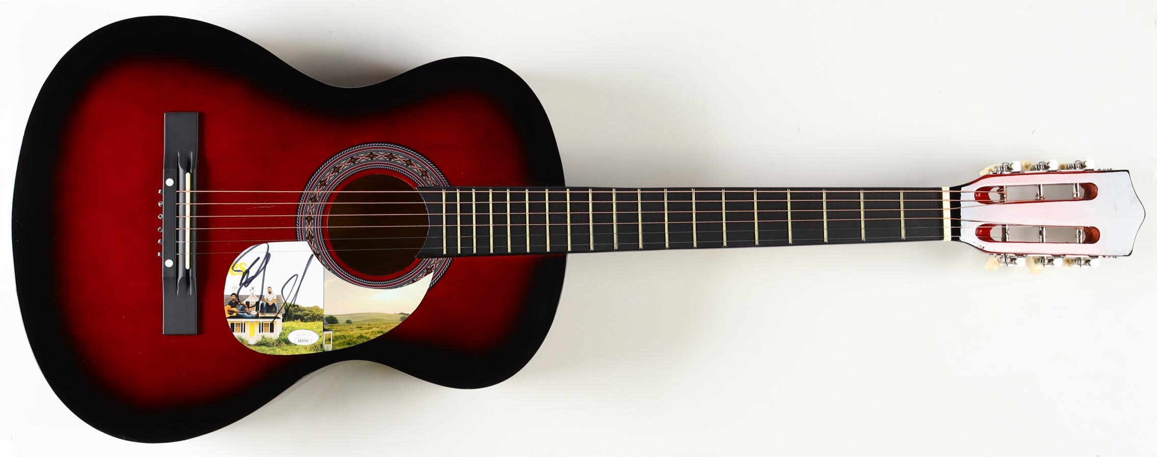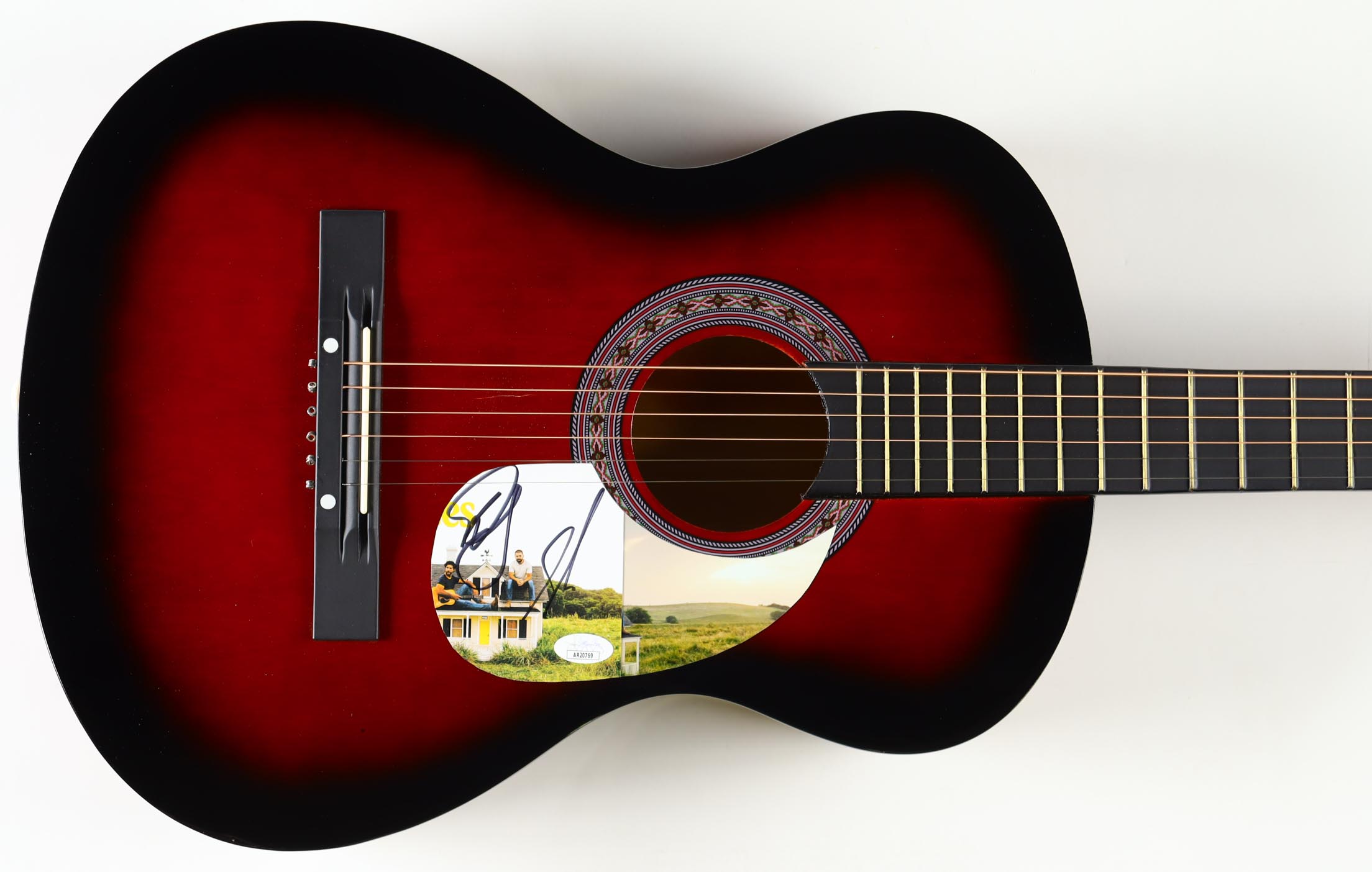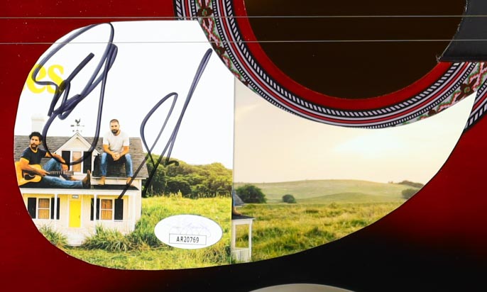 Acoustic guitar measures approximately 38" in length and has been hand-signed a cut that has been repurposed as a pick-guard by Dan Smyers and Shay Mooney.