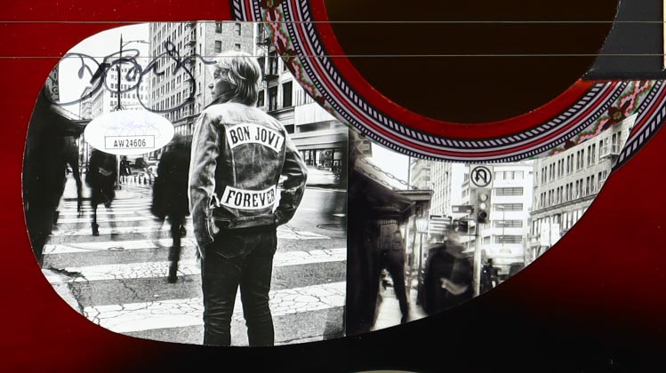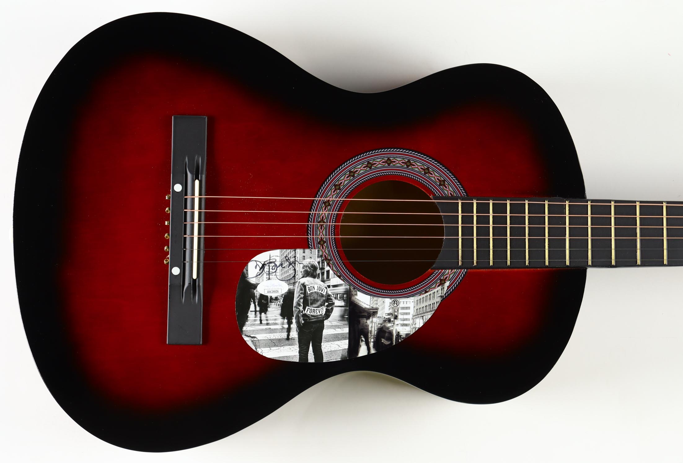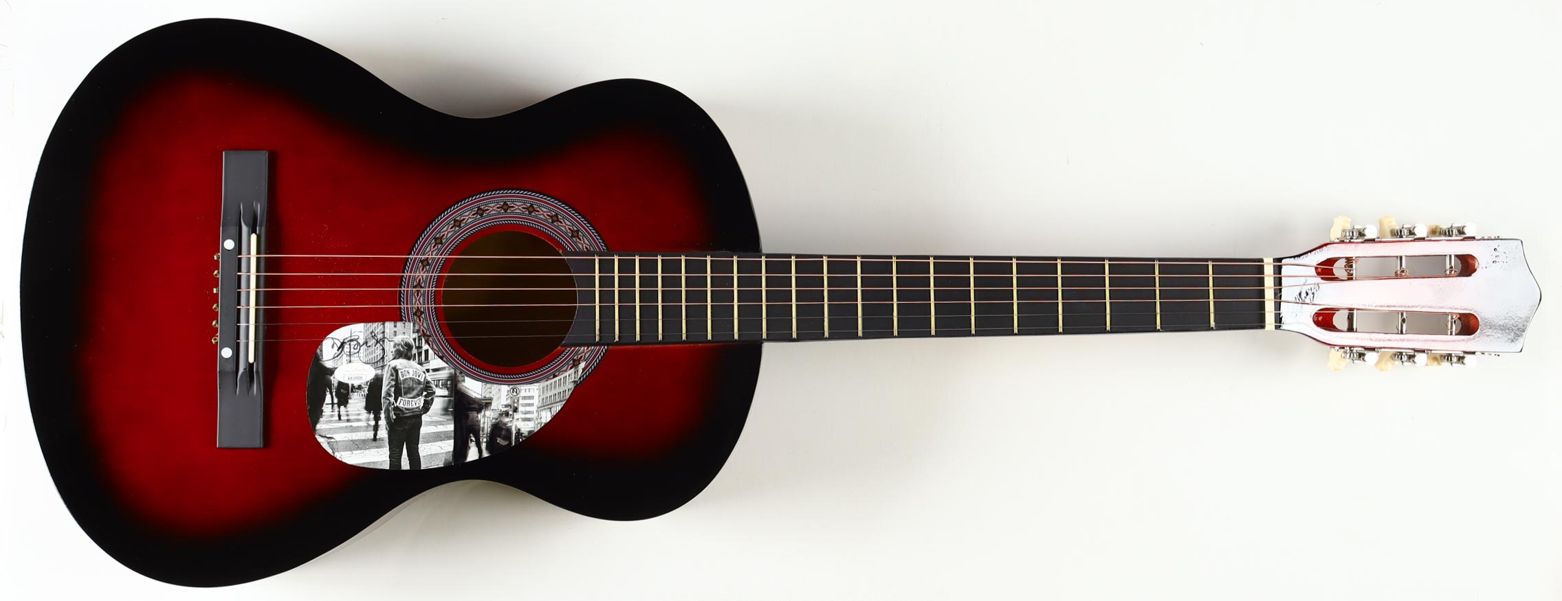 Acoustic guitar measures approximately 38" in length and has been hand-signed on a cut that has been repurposed as the pick-guard by Jon Bon Jovi.