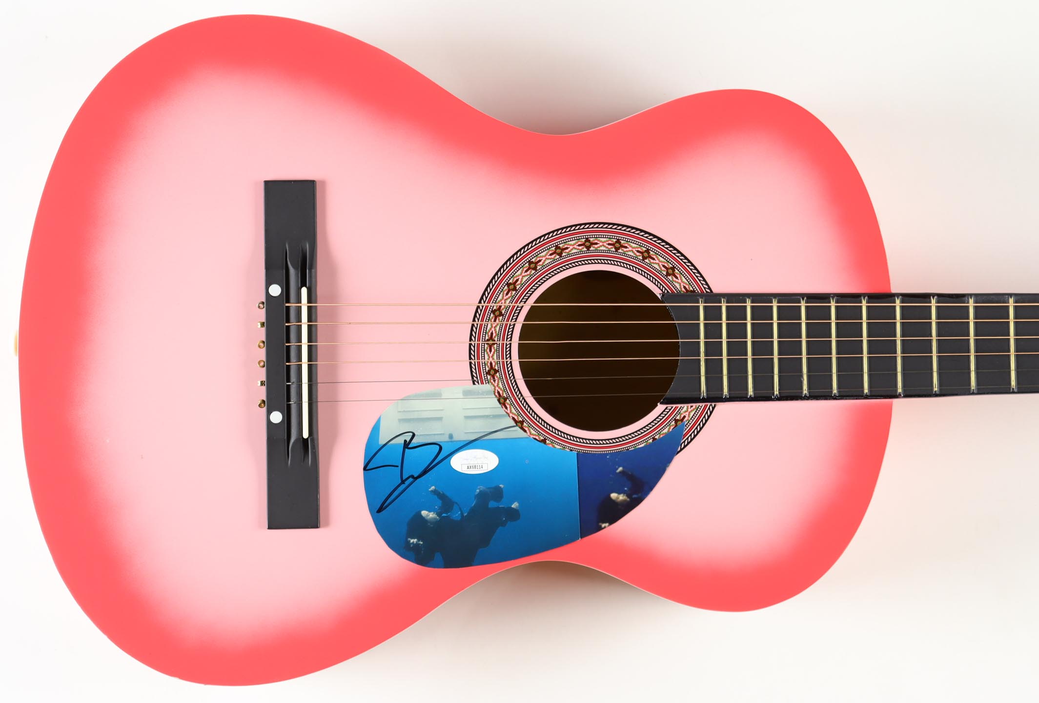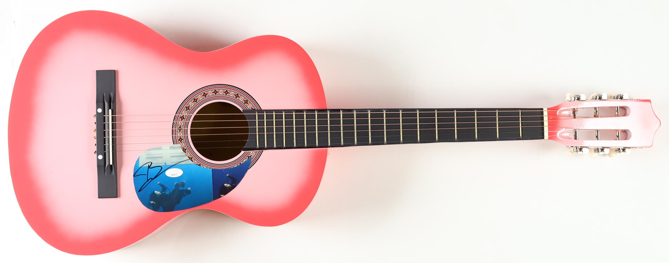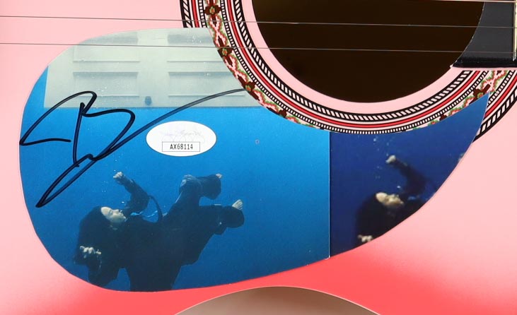 Acoustic guitar measures approximately 38" in length and has been hand-signed on a cut that has been repurposed as the pick-guard by Billie Eilish.