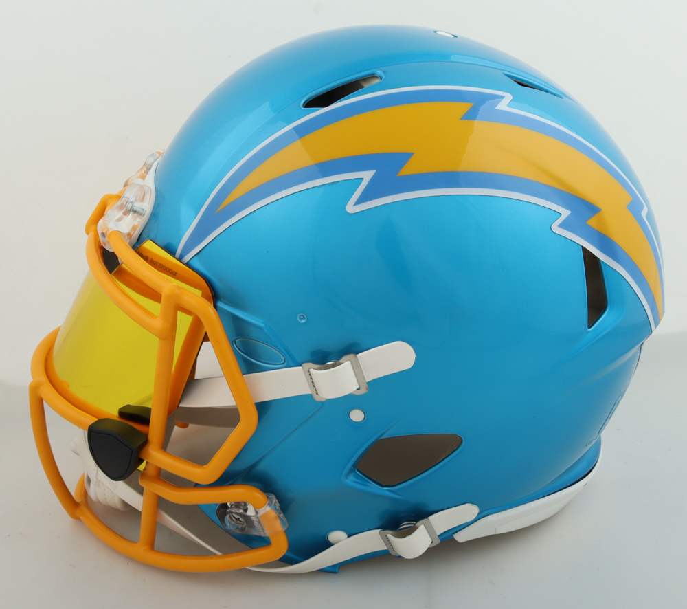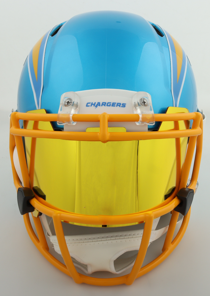 Riddell Los Angeles Chargers full-size authentic on-field flash alternate speed helmet with visor. Hand-signed and inscribed by Justin Herbert.