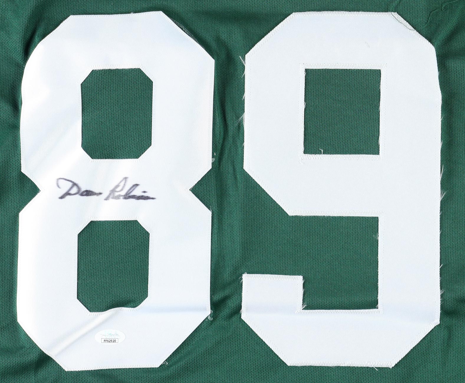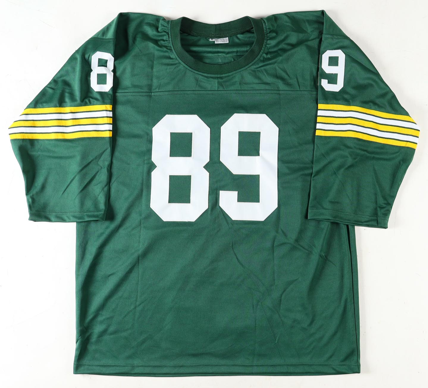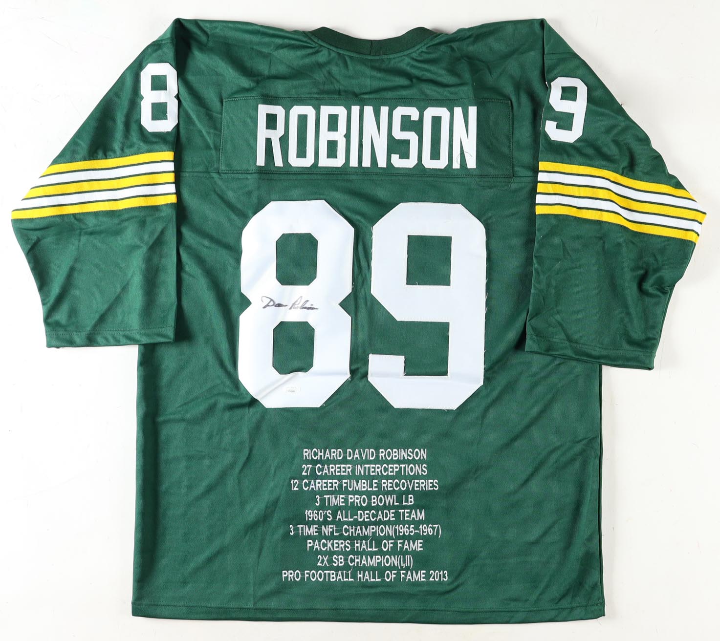 Custom jersey with everything sewn on, size XL. Hand-signed Dave Robinson (HOF). Robinson's career highlights have been custom stitched onto the back of the jersey below the reverse numbers.