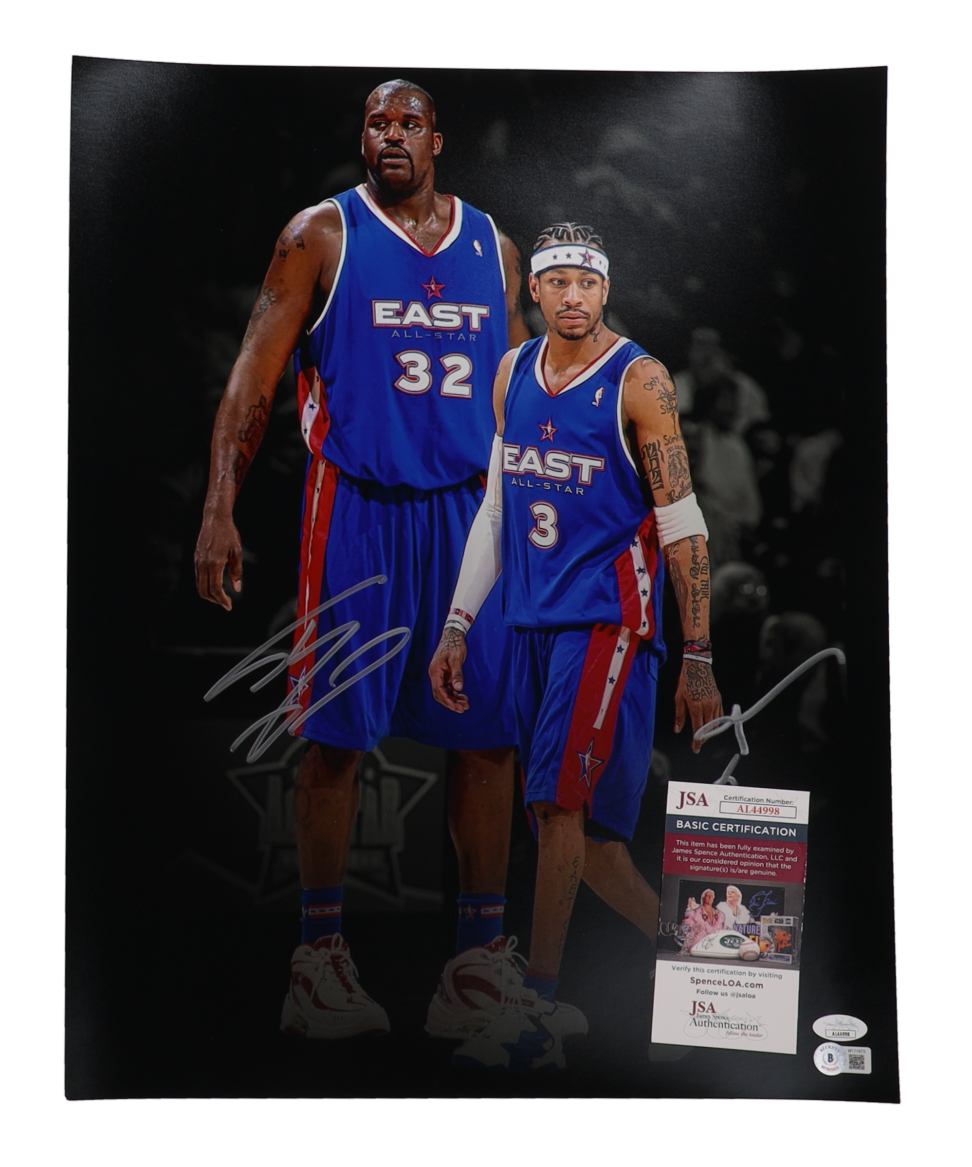 Photo measures approximately 16" x 20" in size. Hand-signed by Allen Iverson (Philadelphia 76ers, HOF) and Shaquille O'Neal (Los Angeles Lakers, HOF).