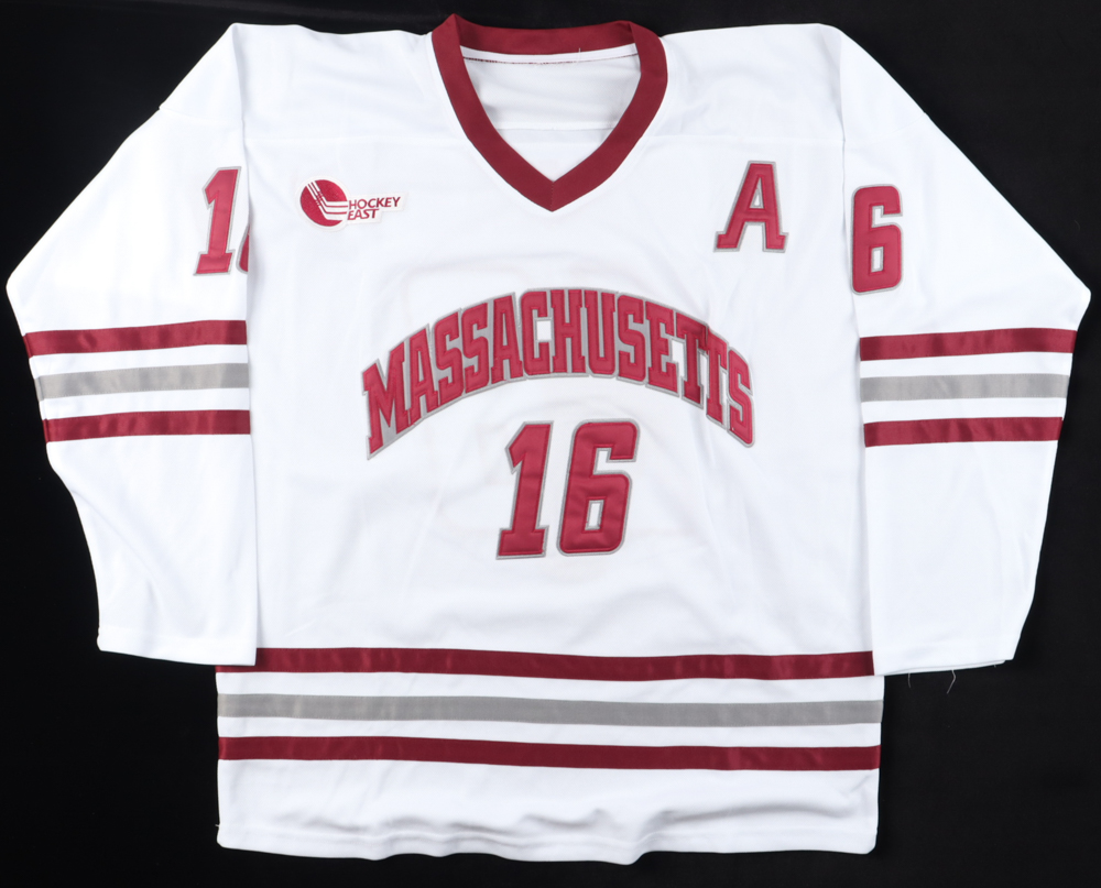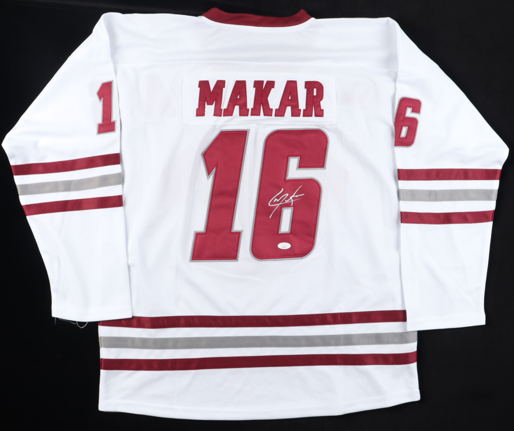 Custom jersey with everything sewn on, size XL. Hand-signed by Cale Makar.