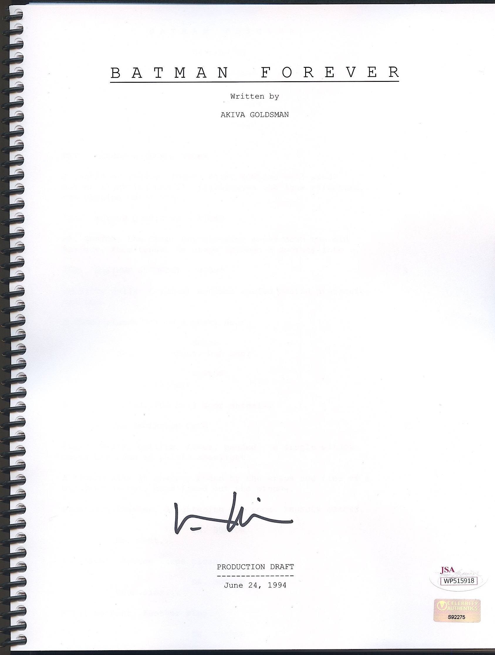 "Batman Forever" replica full-length script has been hand-signed in black felt-tip pen by Val Kilmer (Batman).