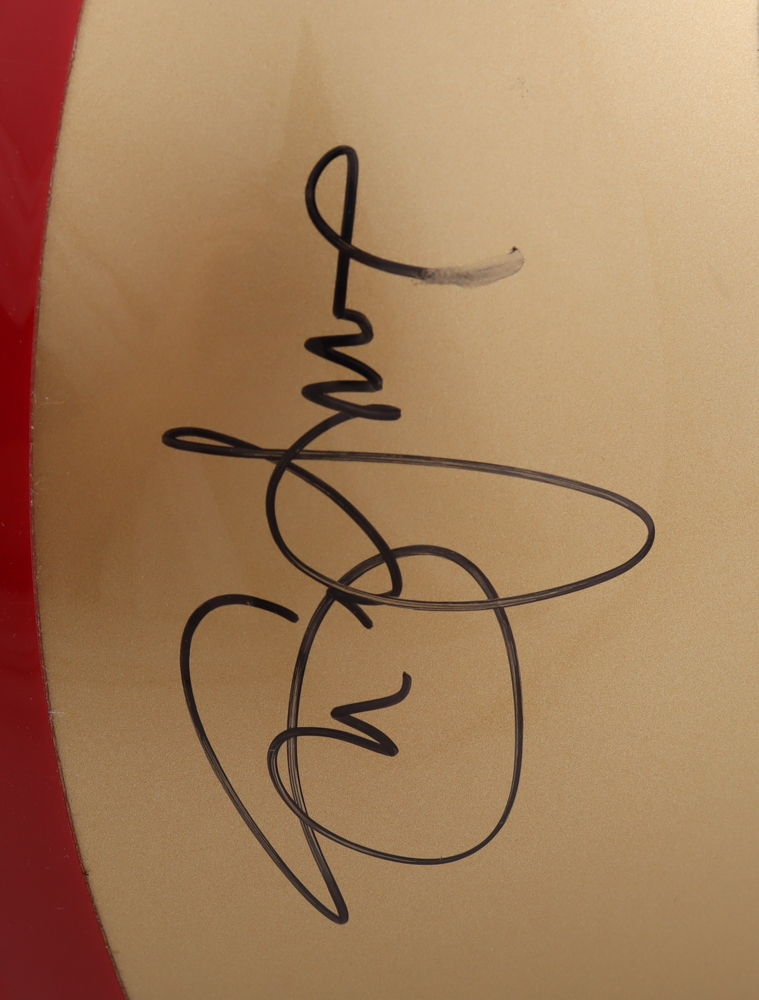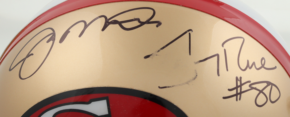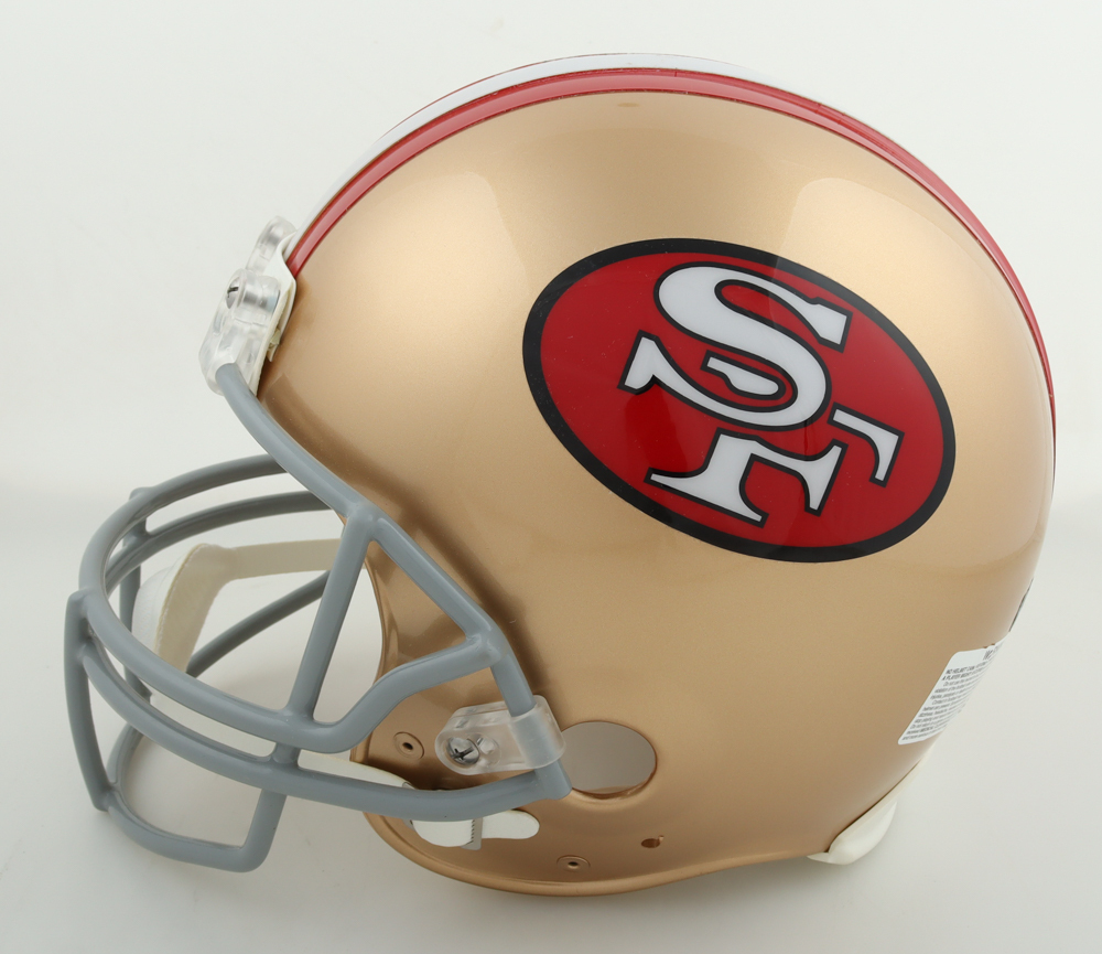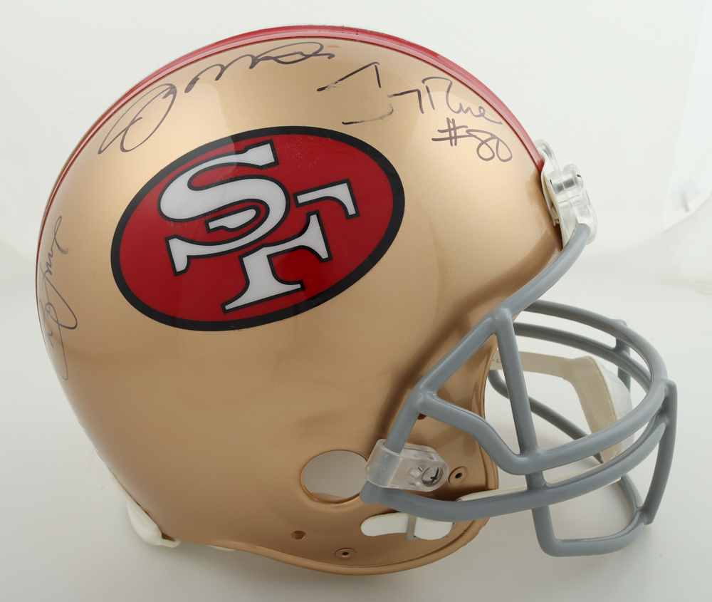 Riddell San Francisco 49ers full-size authentic on-field helmet. Hand-signed by Joe Montana (HOF), Steve Young (HOF), and Jerry Rice (HOF). Please note signatures are partially smudged or faded.