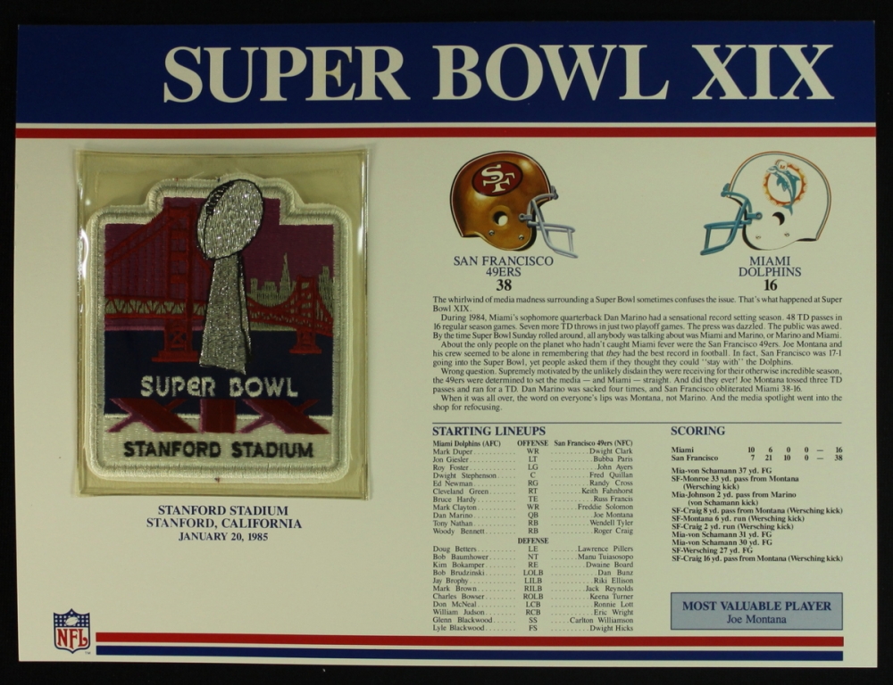 Super Bowl XIX Patch With 12x9 Scorecard: 49ers vs. Dolphins