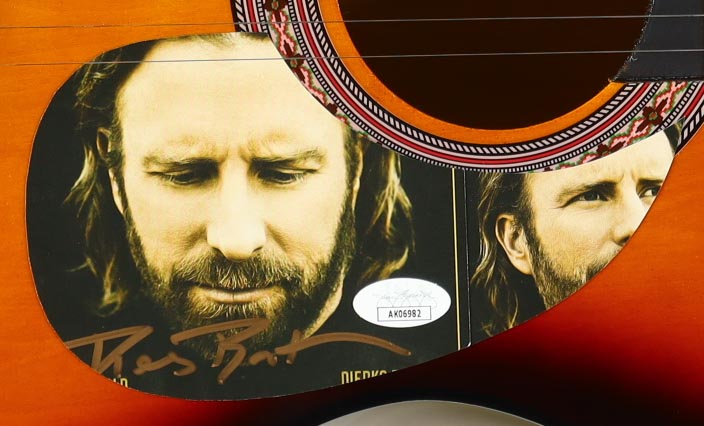 Acoustic guitar measures approximately 38" in length and has been hand-signed on cut that has been repurposed as a pick-guard by Dierks Bentley.