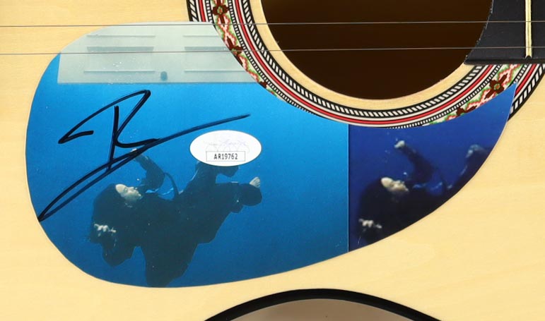 Acoustic guitar measures approximately 38" in length and has been hand-signed on a cut that has been repurposed as the pick-guard by Billie Eilish.