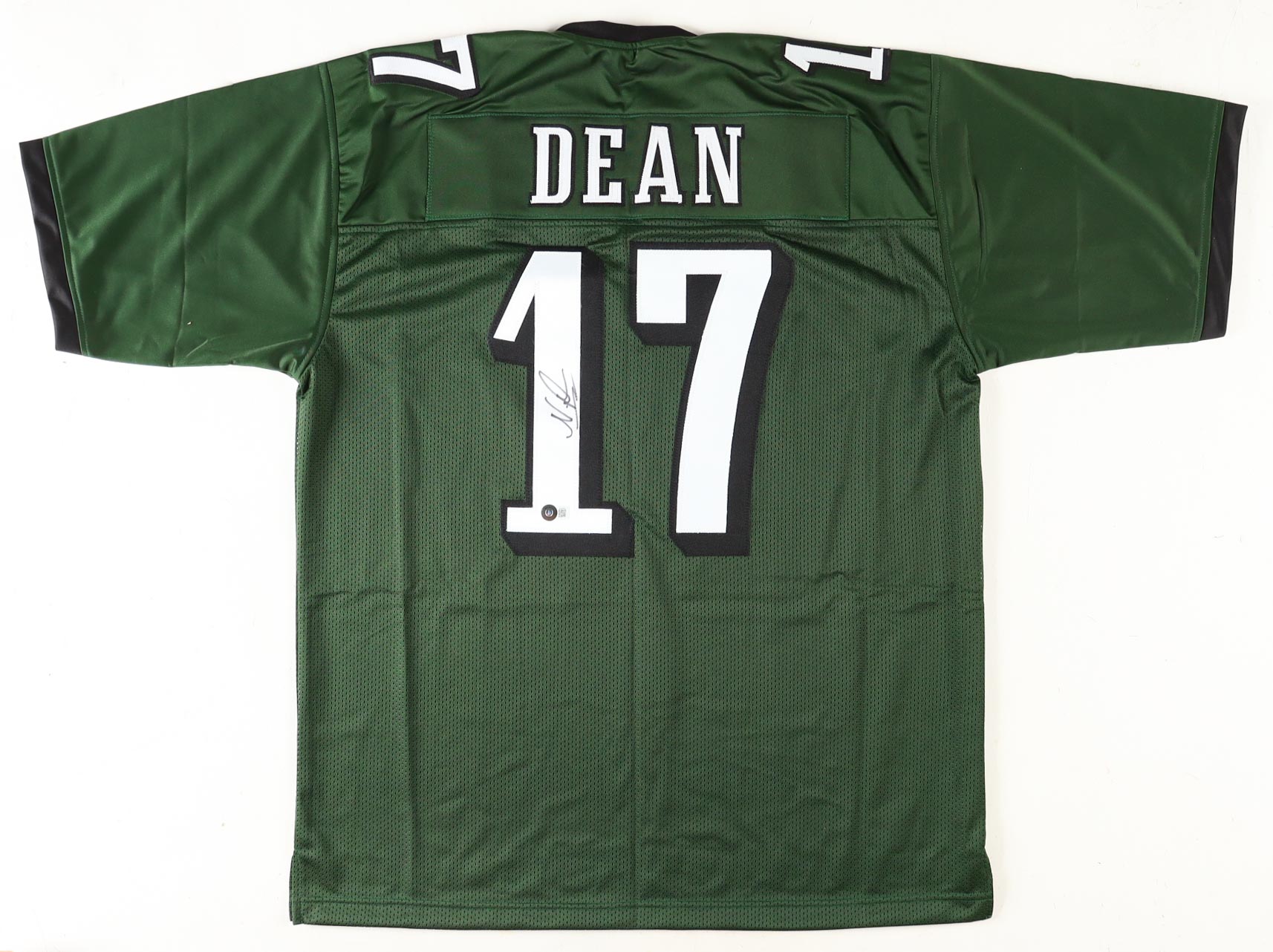Custom jersey with everything sewn on, size XL. Hand-signed by Nakobe Dean.