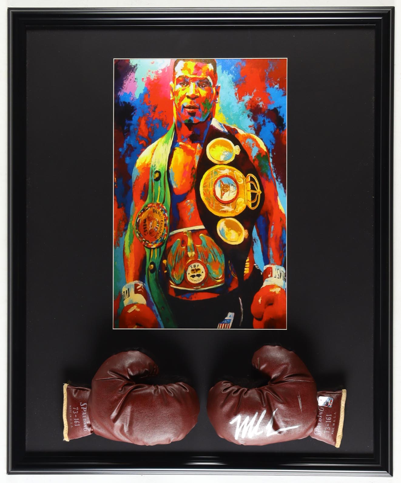 Custom frame measures approximately 24" x 29.25" in size and features a pair of Spalding Burgundy Boxing Gloves with the left glove hand-signed by Mike Tyson (HOF). Display also includes a Multi-Colored Art Print of Tyson by Artist LeRoy Neiman (D. 2012). Please refer to photos for more details on the condition of the display.