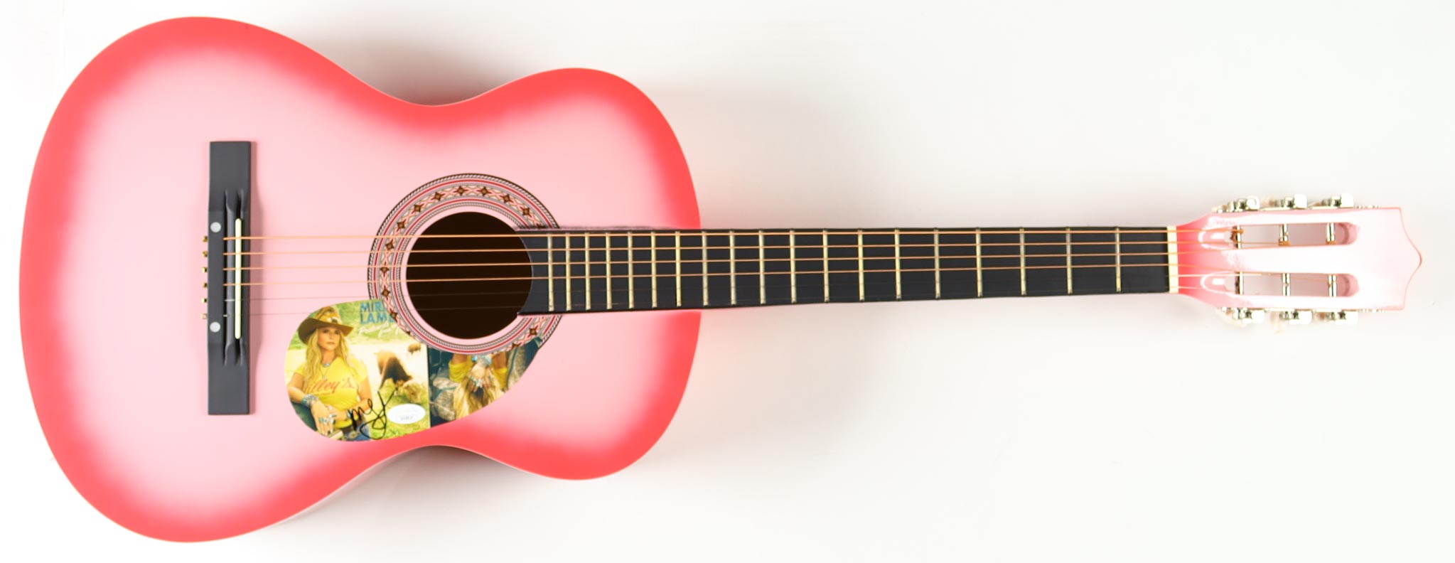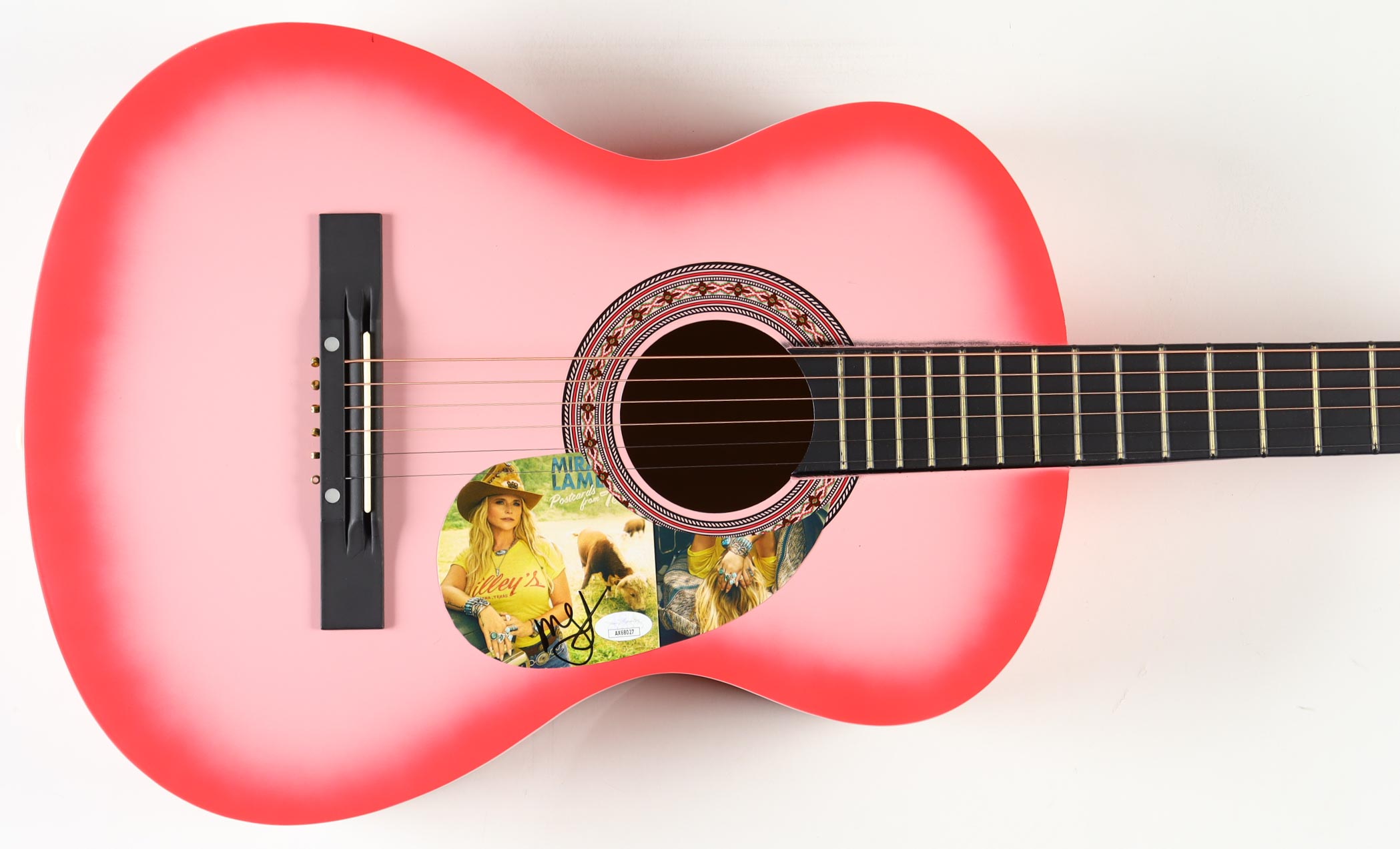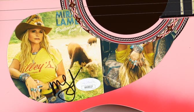 Acoustic guitar measures approximately 38" in length and has been hand-signed on a cut that has been repurposed as the pick-guard by Miranda Lambert.