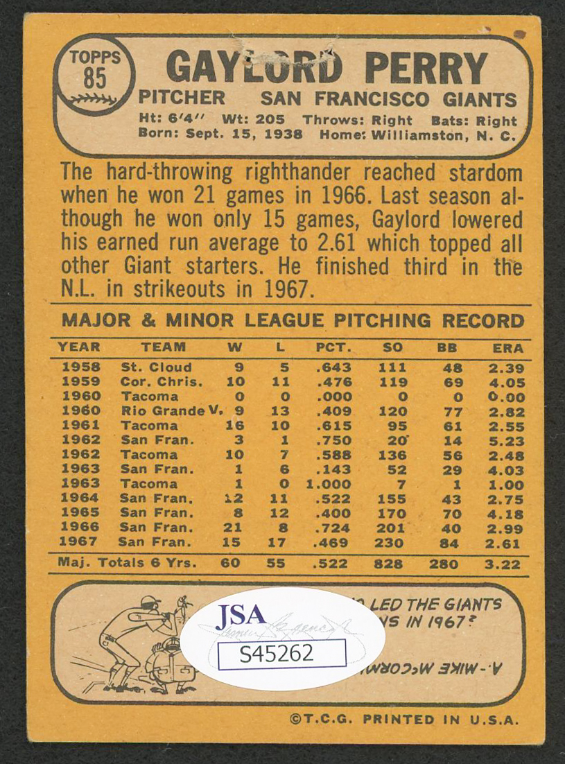 Gaylord Perry Signed 1968 Topps #85 Baseball Card (JSA COA)