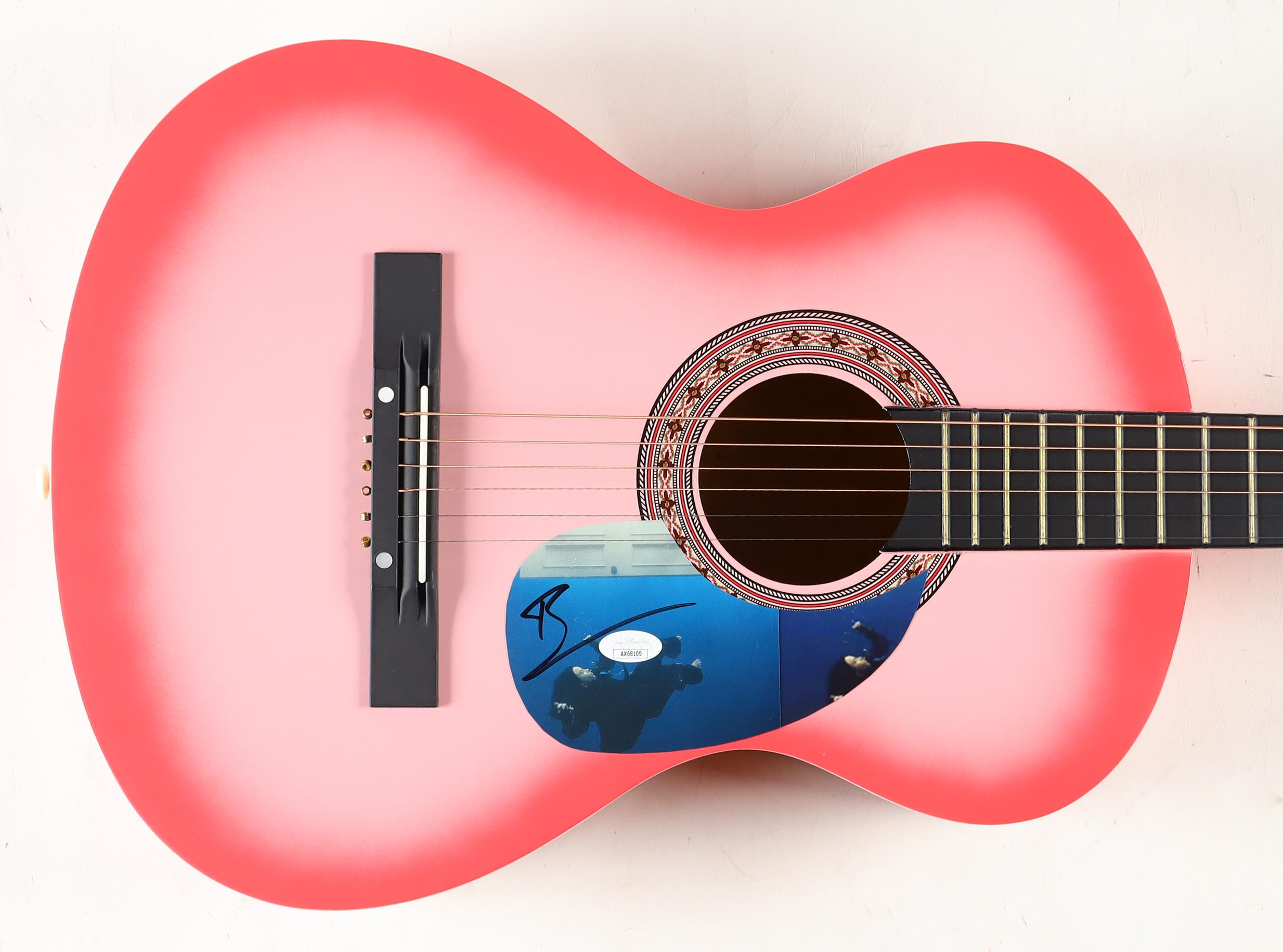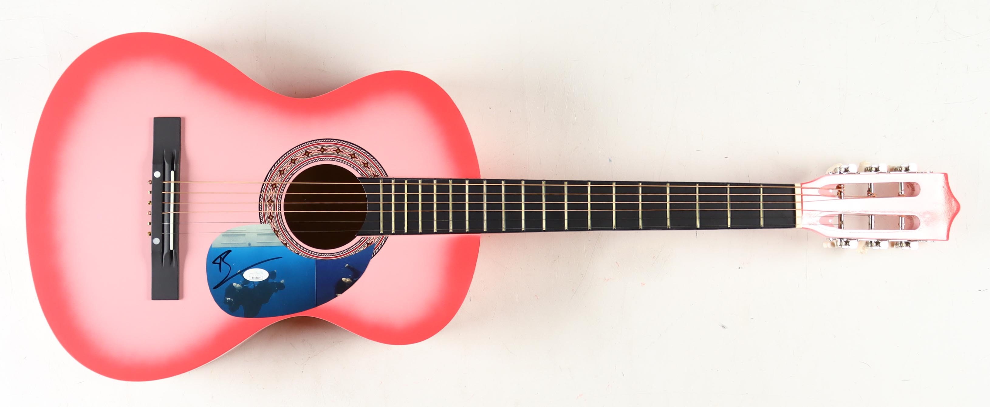 Acoustic guitar measures approximately 38" in length and has been hand-signed on a cut that has been repurposed as the pick-guard by Billie Eilish.