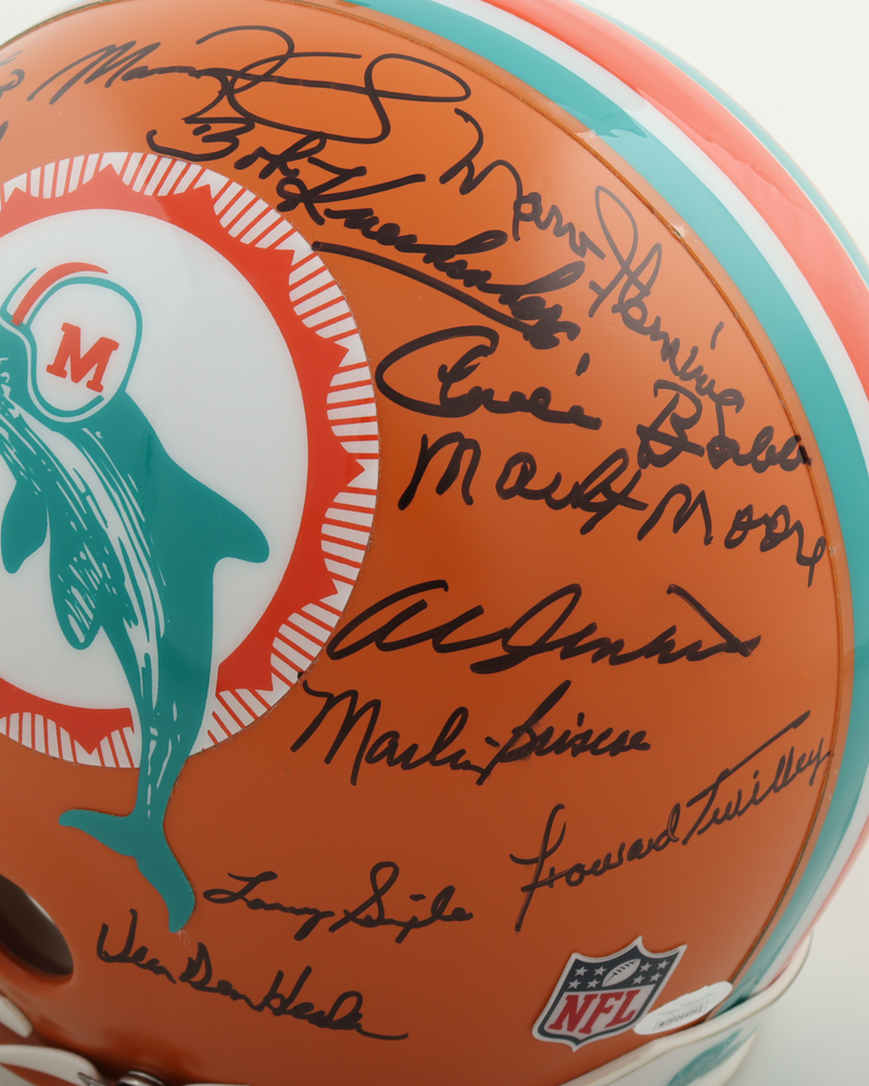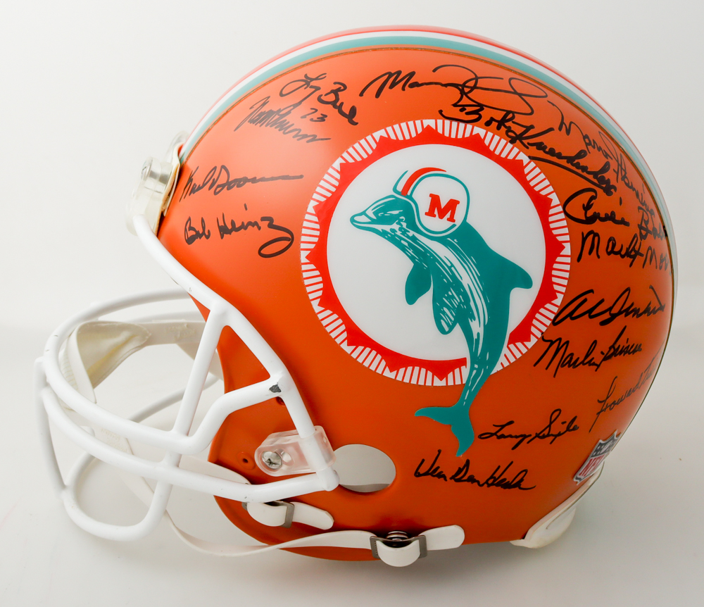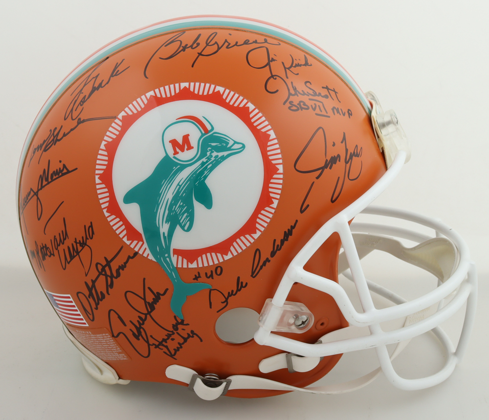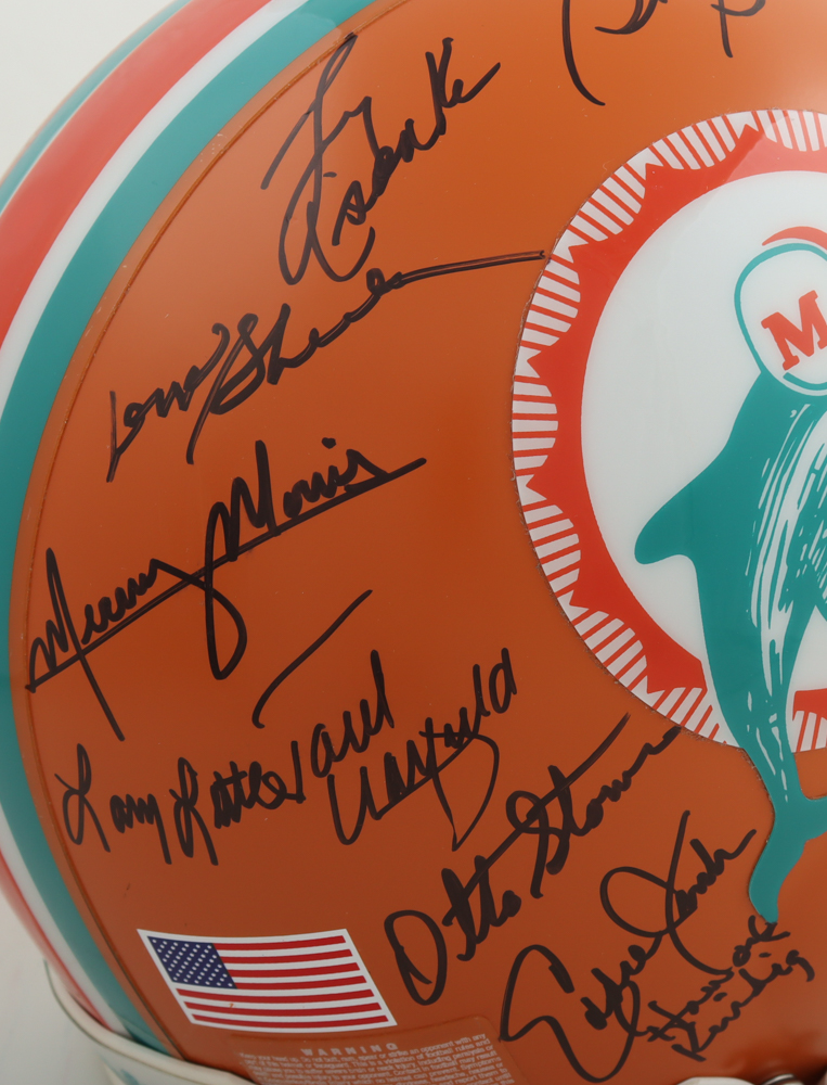 Riddell full-size authentic Miami Dolphins helmet. Hand-signed by (27) with Don Shula, Jim Kiick, Charlie Babb, Bob Kuechenberg, Howard Kindig, Karl Noonan, Marlin Briscoe, Paul Warfield, Howard Twilley, Otto Stowe, Larry Seiple, Jake Scott, Mercury Morris, Maulty Moore, Larry Little, Jim Langer, Ed Jenkins, Al Jenkins, Vern Den Herder, Bob Heinz, Bob Griese, Marv Flemming, Manny Fernandez, Norm Evans, Larry Csonka, Larry Ball and Dick Anderson.
