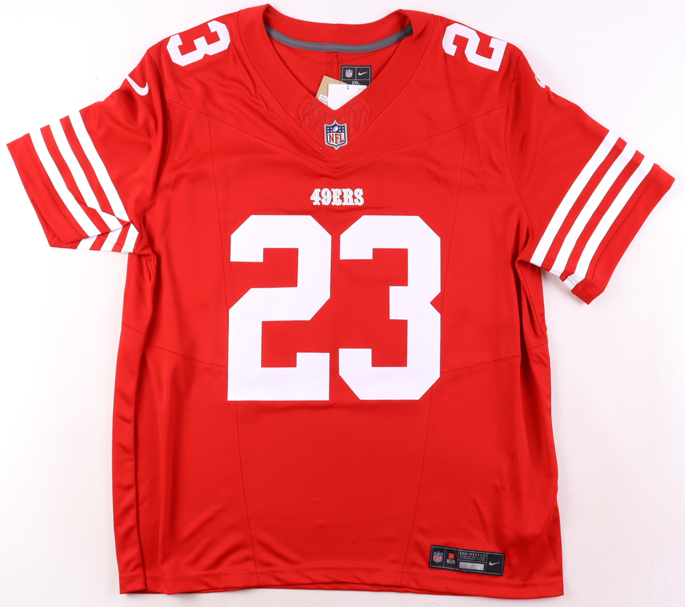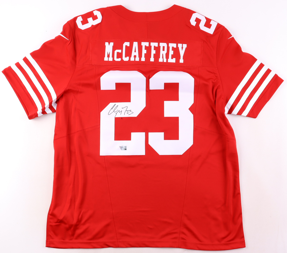 Nike style jersey with everything pressed on, size XXL. Hand-signed by Christian McCaffrey (San Francisco 49ers). Please note, the jersey has a stray pen mark.