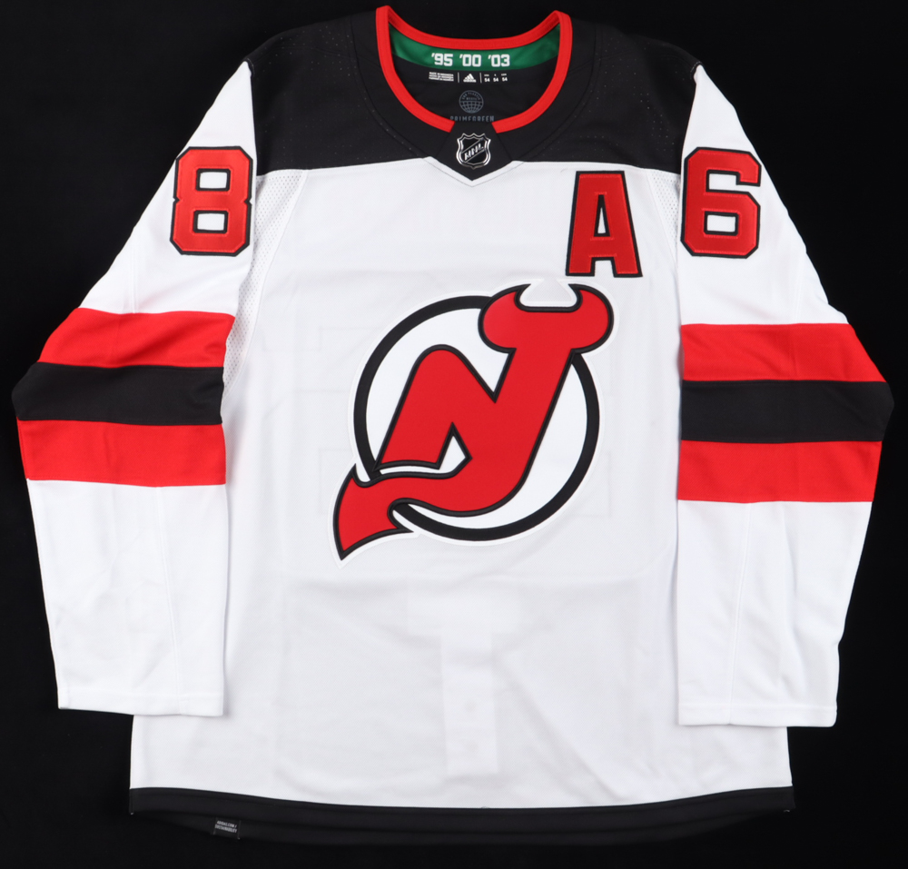 Adidas jersey with everything sewn on, size 54. Hand-signed and inscribed by Jack Hughes (New Jersey Devils). Please note, there is a stain on the reverse #6.