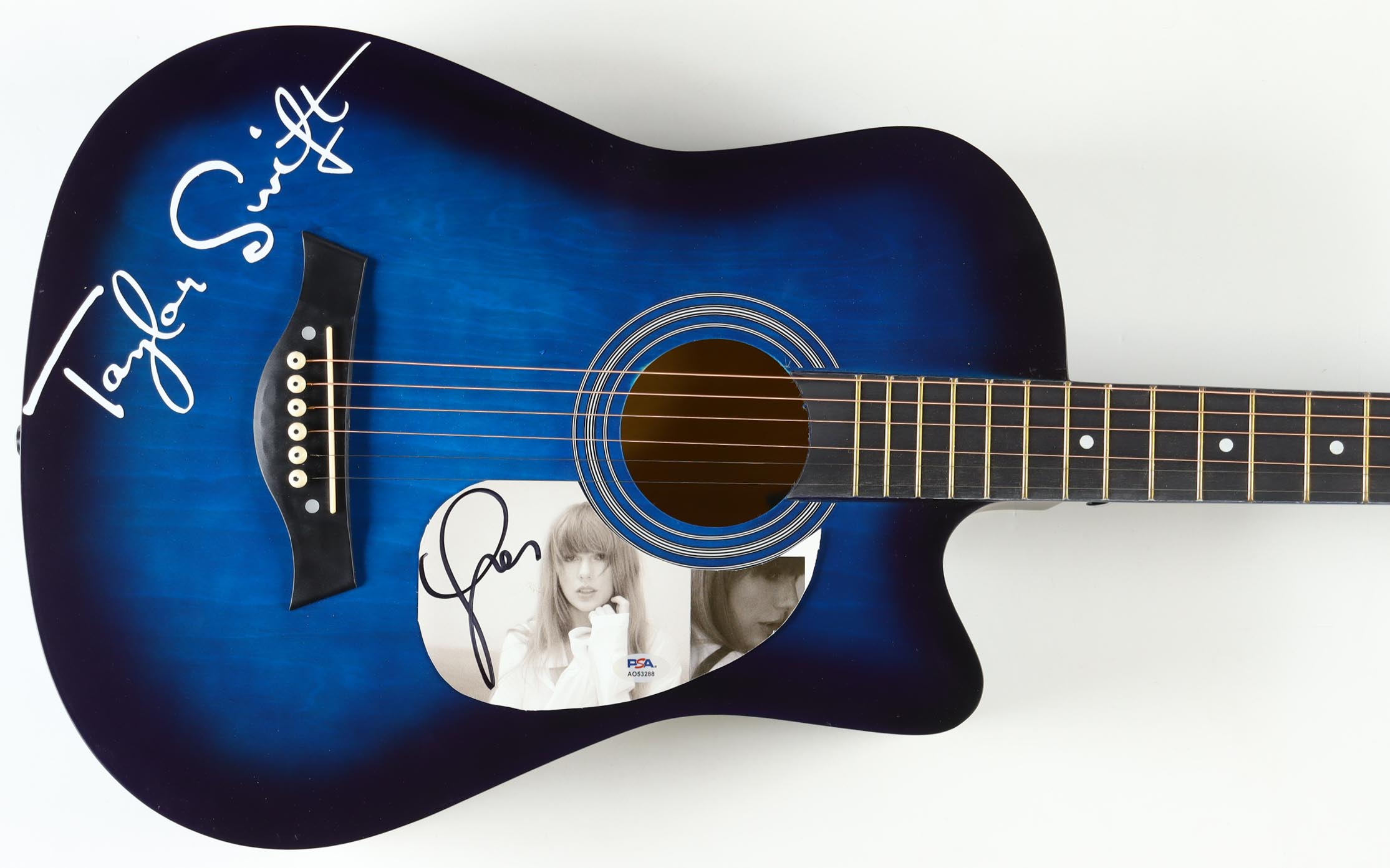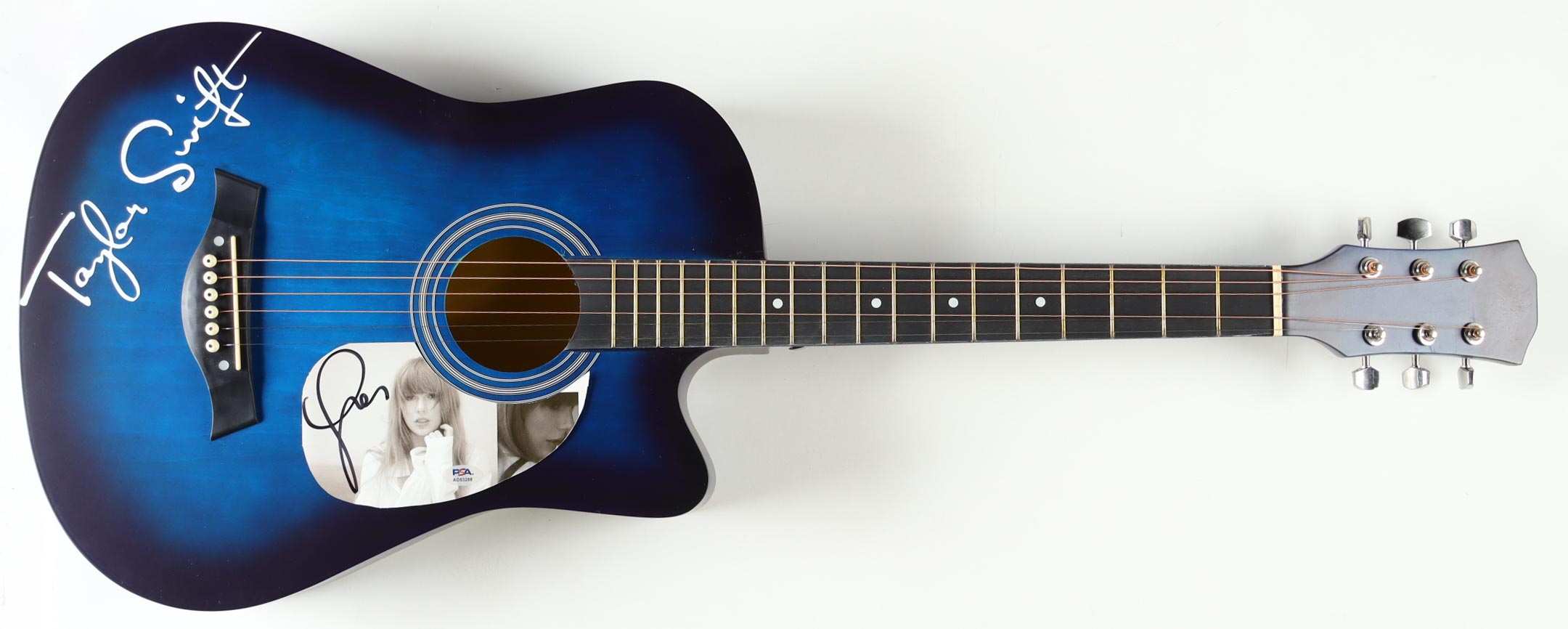 Acoustic guitar measures approximately 39" long and has been hand-signed on the pick guard by Taylor Swift.