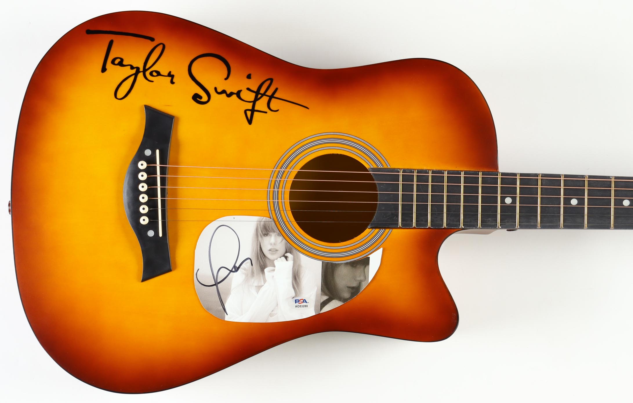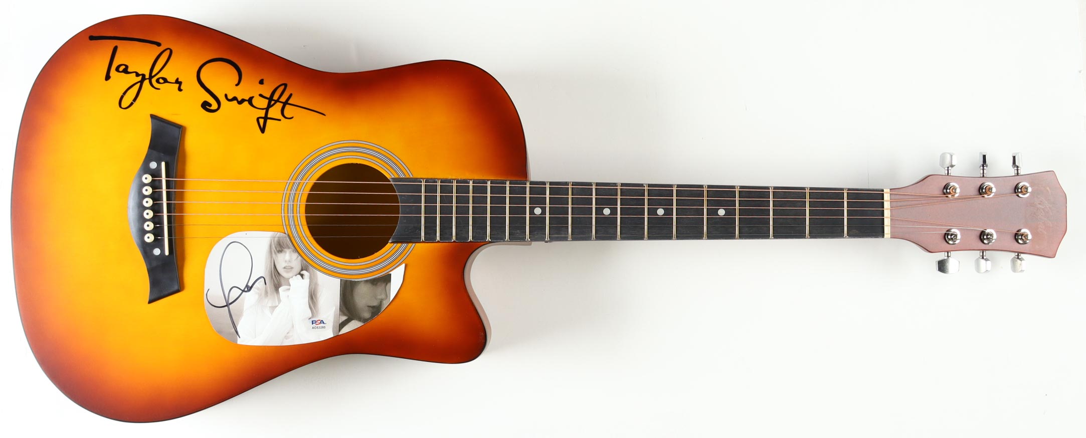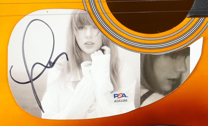 Acoustic guitar measures approximately 39" long and has been hand-signed on the pick guard by Taylor Swift.
