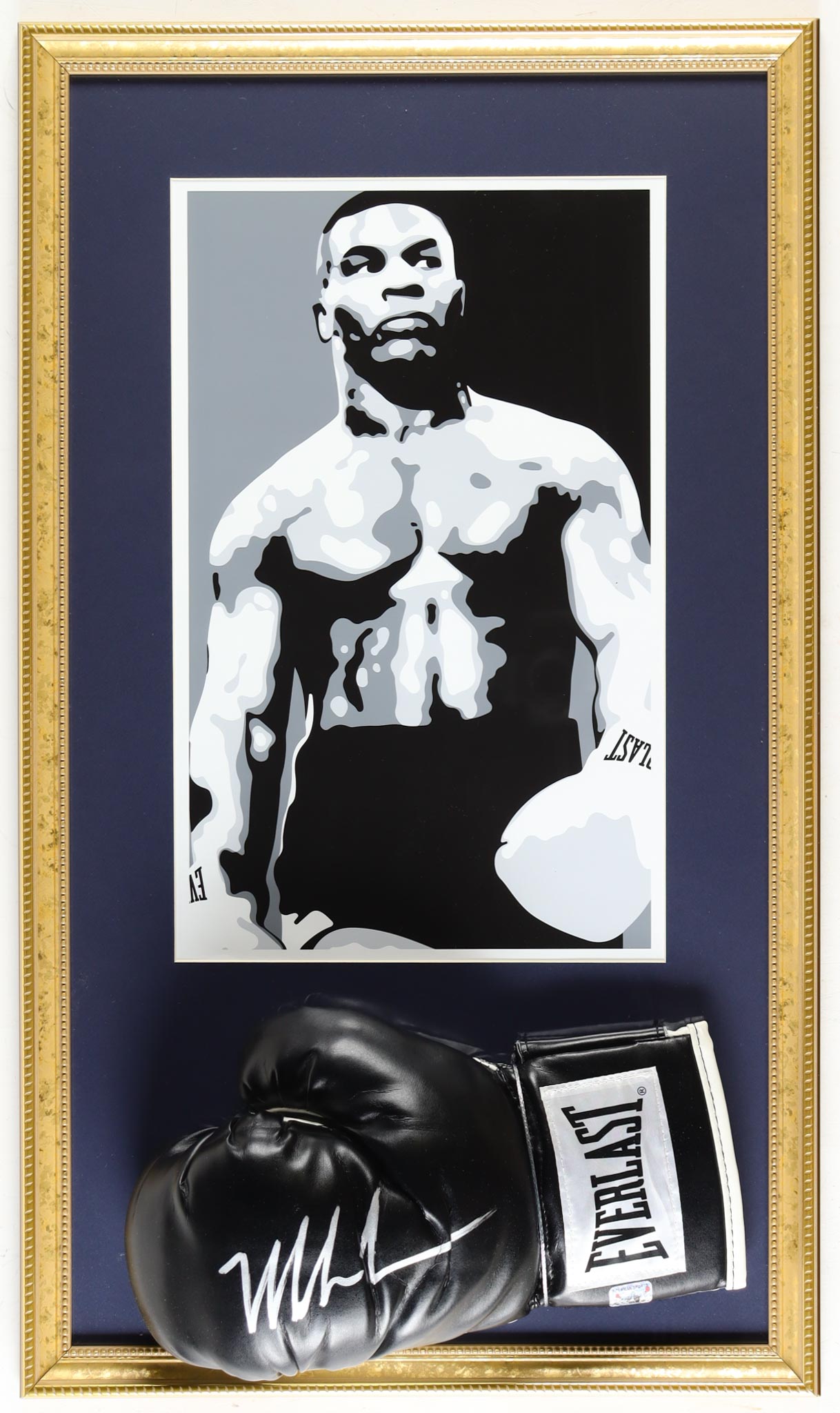Custom frame measures 17" x 30" in size. Features a boxing glove that has been hand-signed by Mike Tyson (HOF).