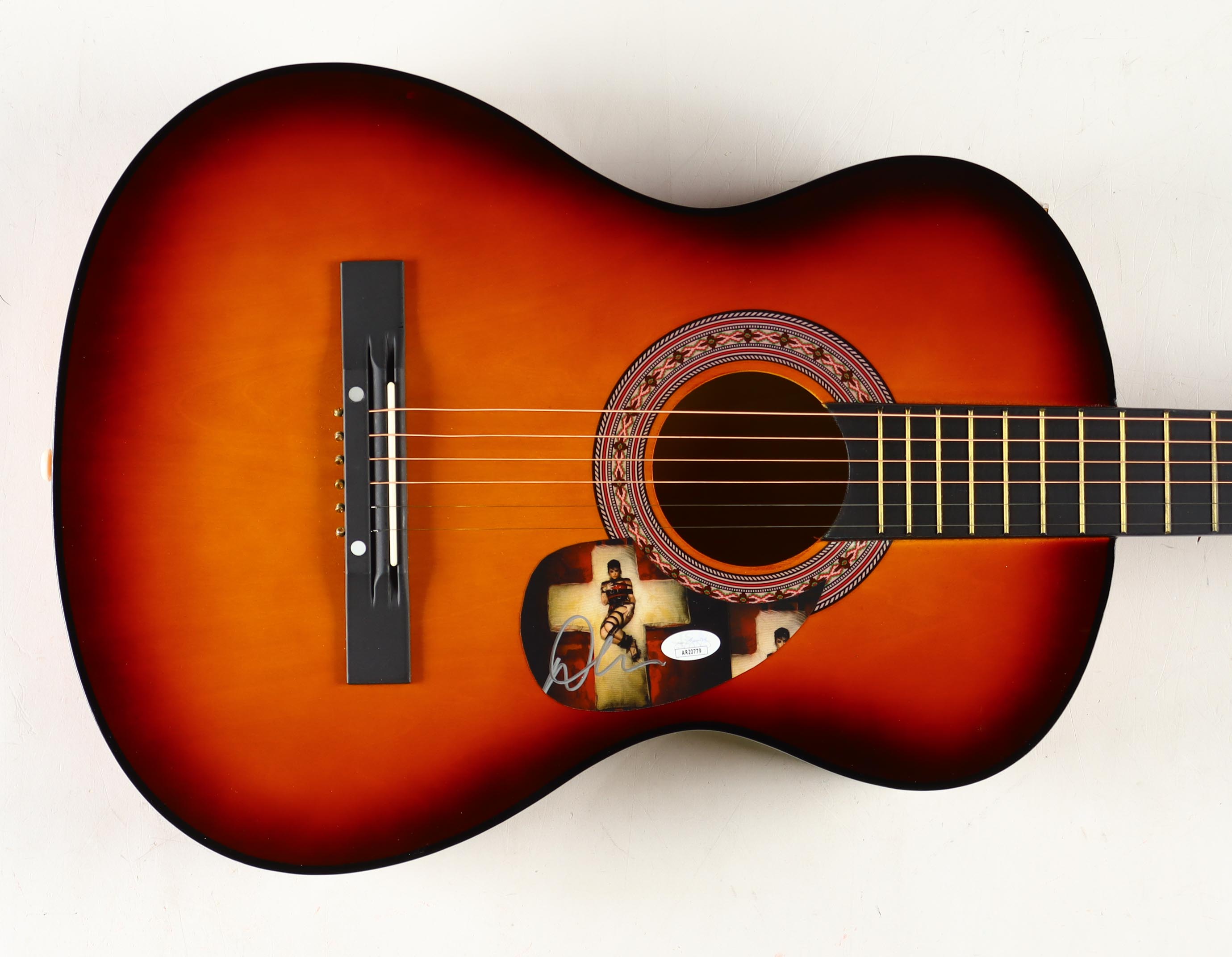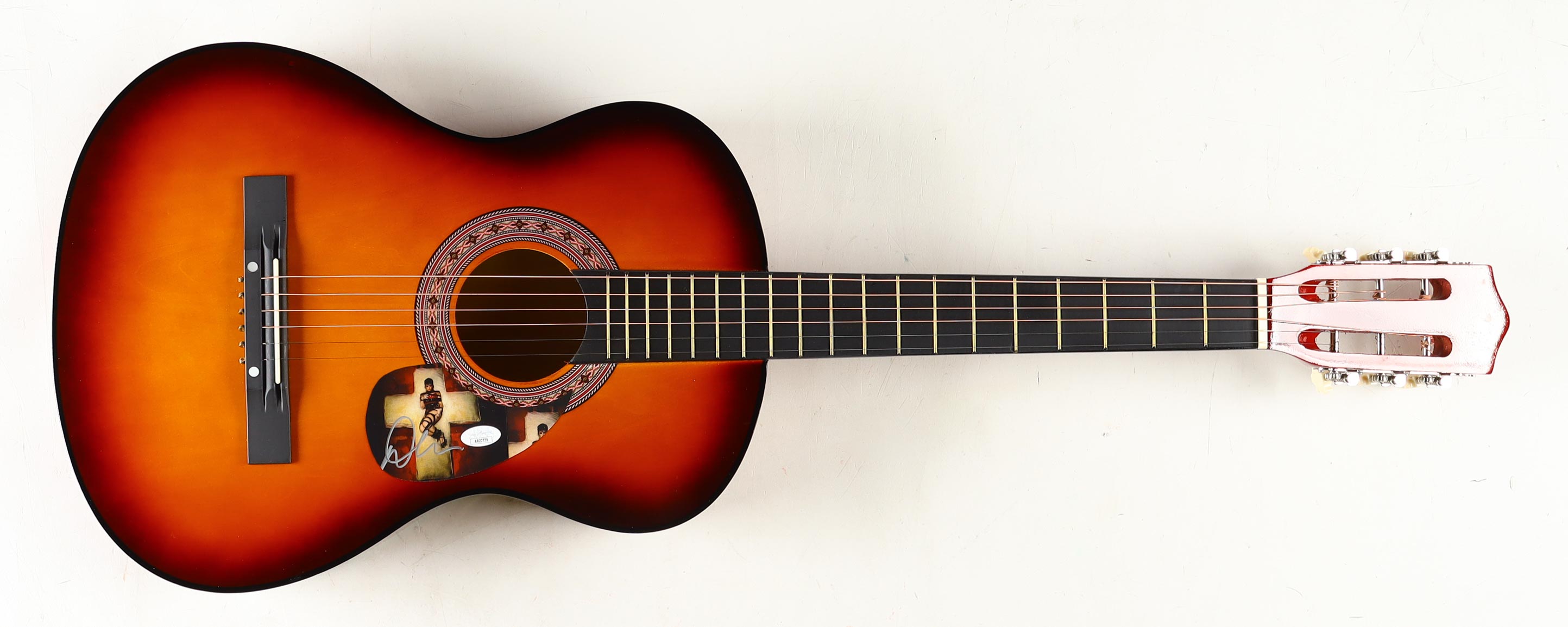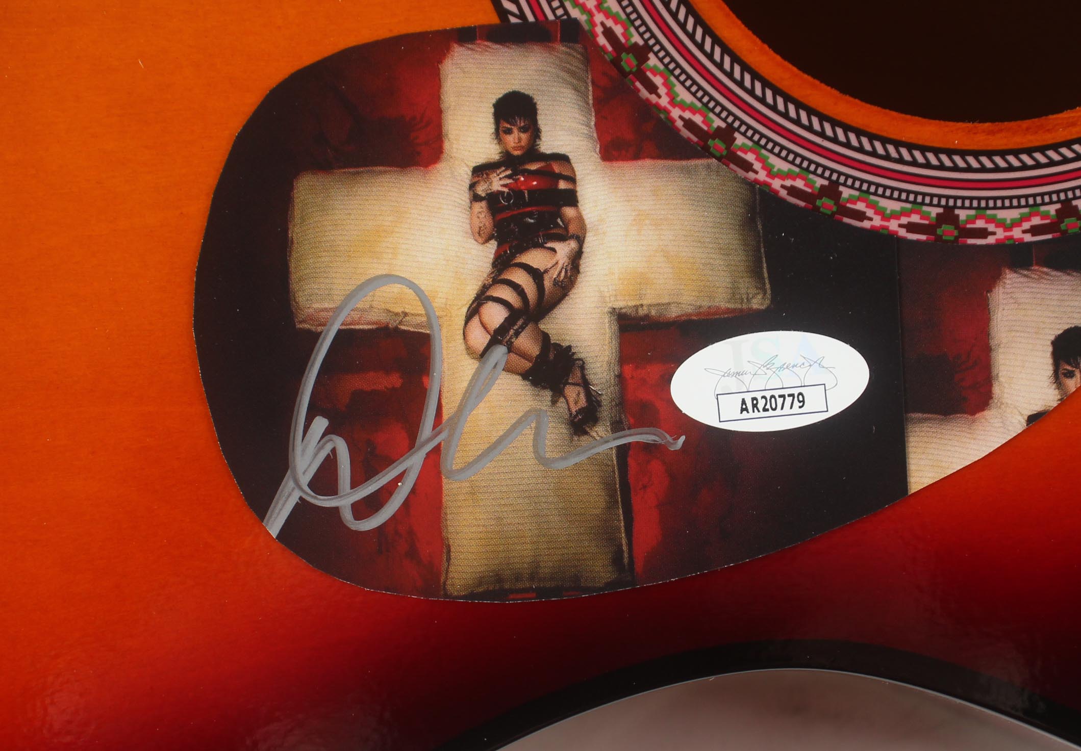 Acoustic guitar measures approximately 38" in length and has been hand-signed on a cut that has been repurposed as a pickguard by Demi Lovato.