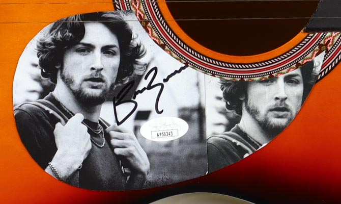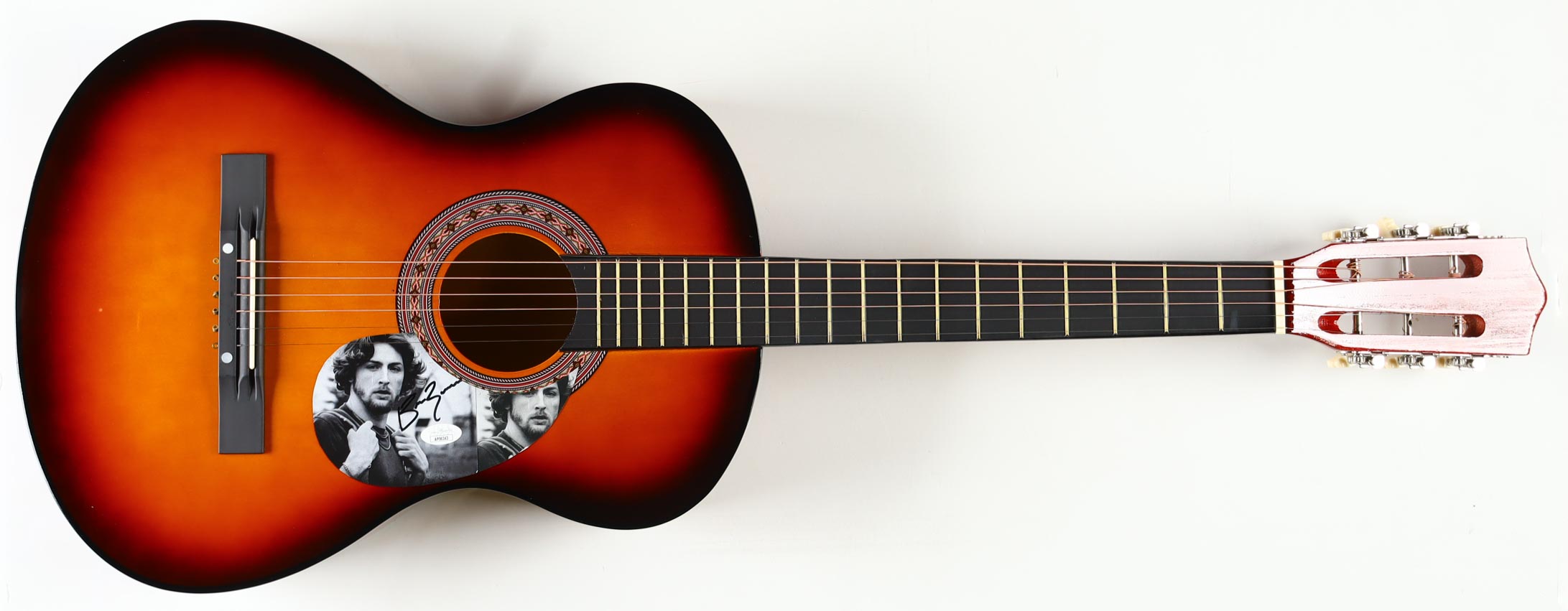 Acoustic guitar measures approximately 38" in length and has been hand-signed on a cut that has been repurposed as the pick-guard by Bailey Zimmerman.