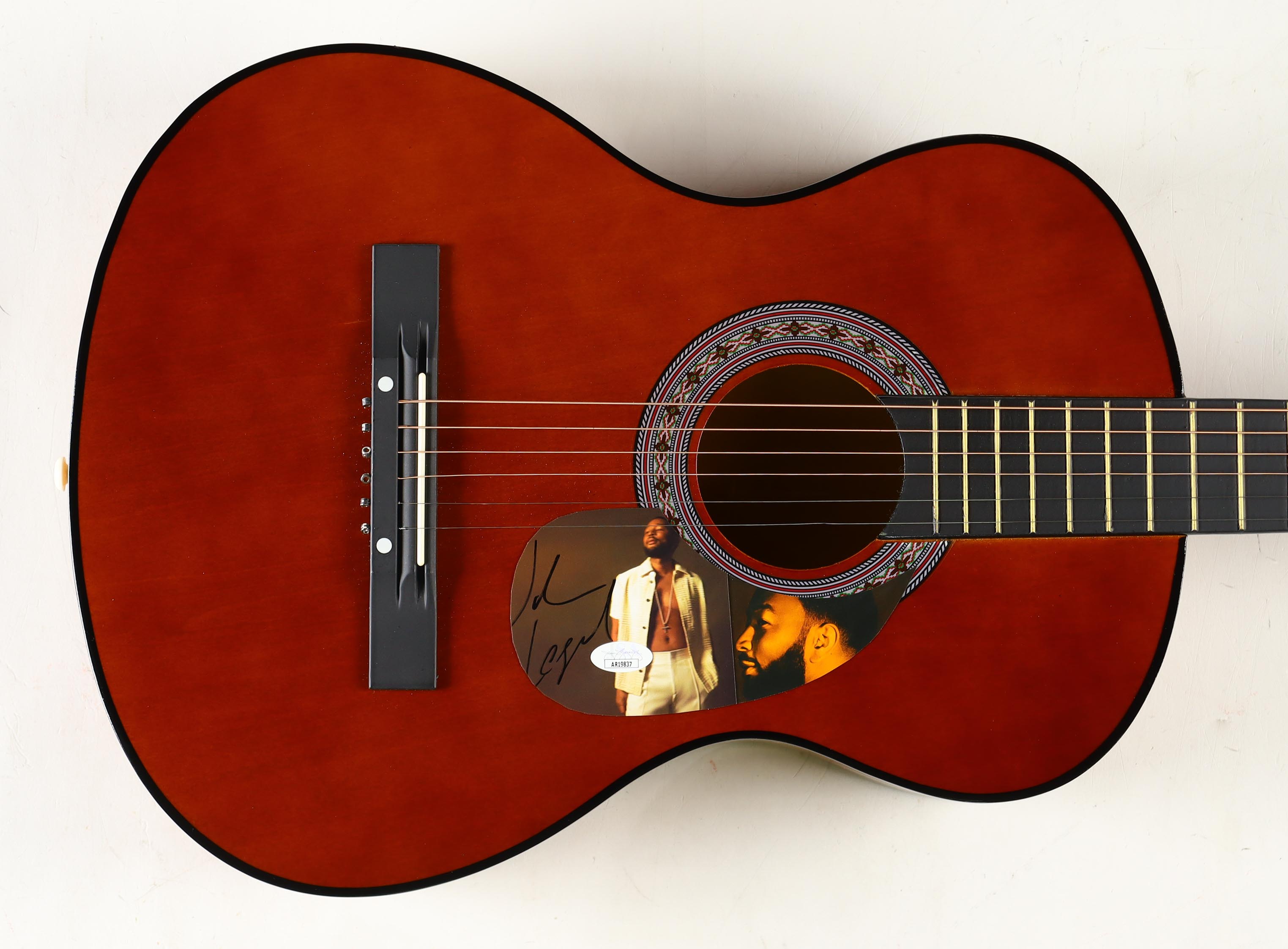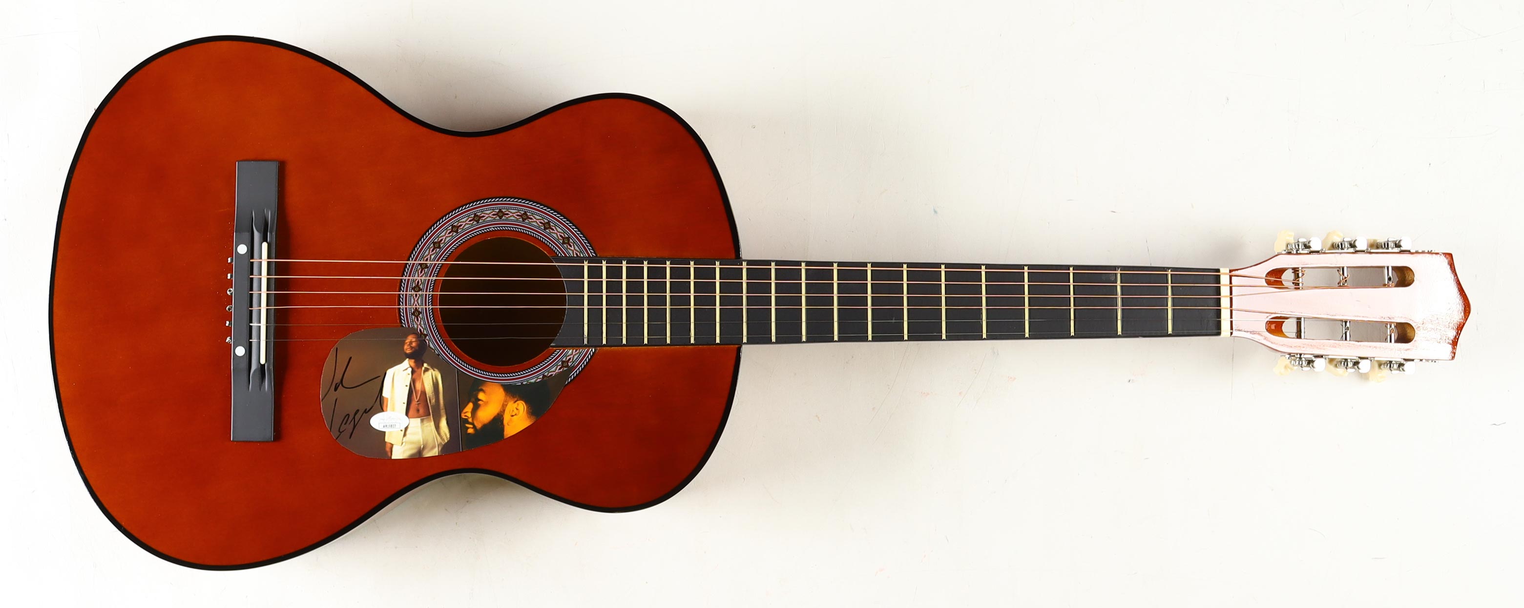 Acoustic guitar measures approximately 38" in length and has been hand-signed by John Legend on a CD cover that has been repurposed as a pick-guard.
