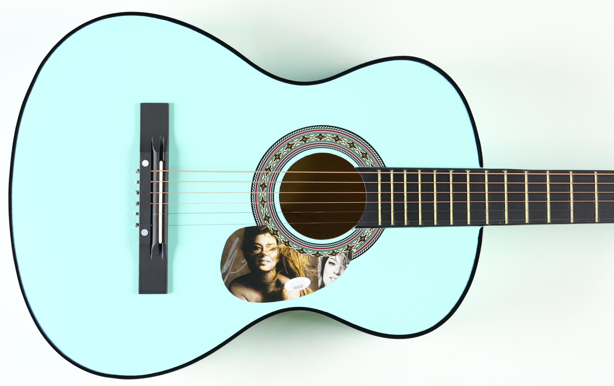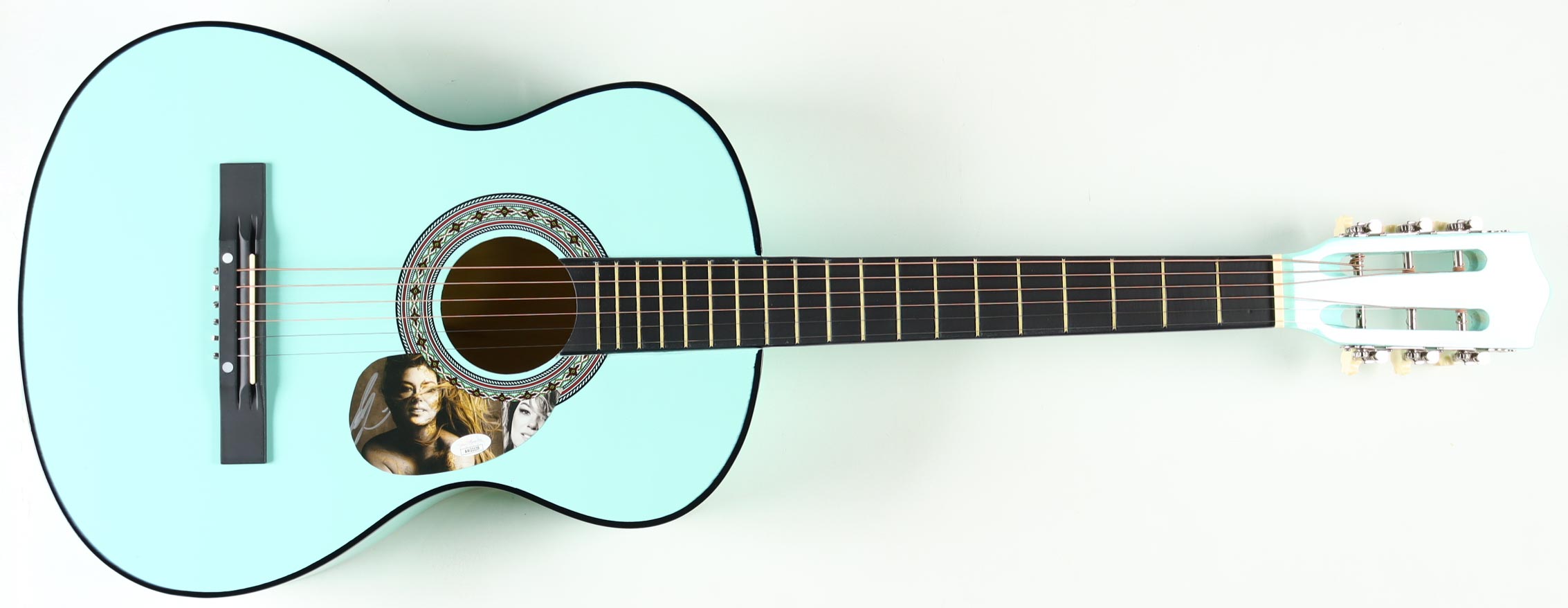 Acoustic guitar measures approximately 38" in length and has been hand-signed on a CD cover that has been repurposed as a pick-guard by Shania Twain.