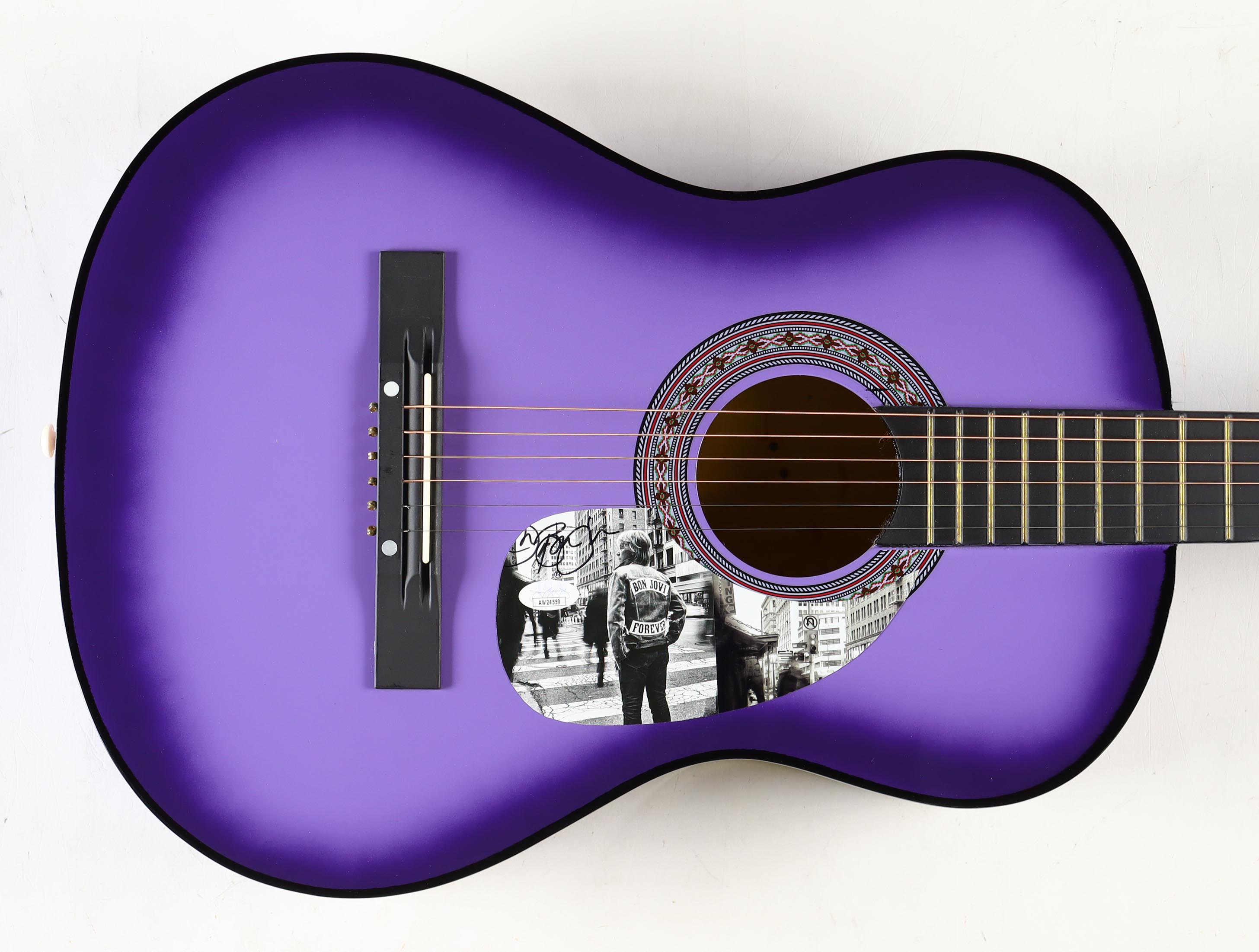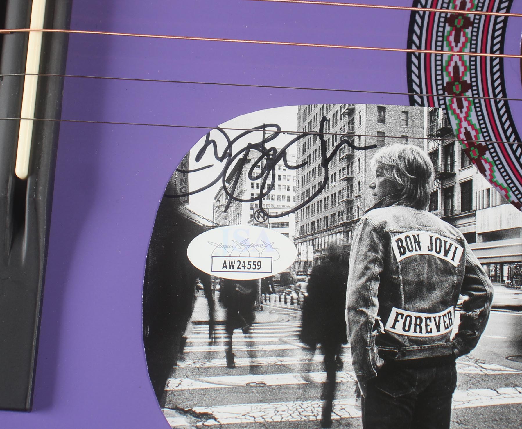 Acoustic guitar measures approximately 38" in length and has been hand-signed on a cut that has been repurposed as the pick-guard by Jon Bon Jovi.
