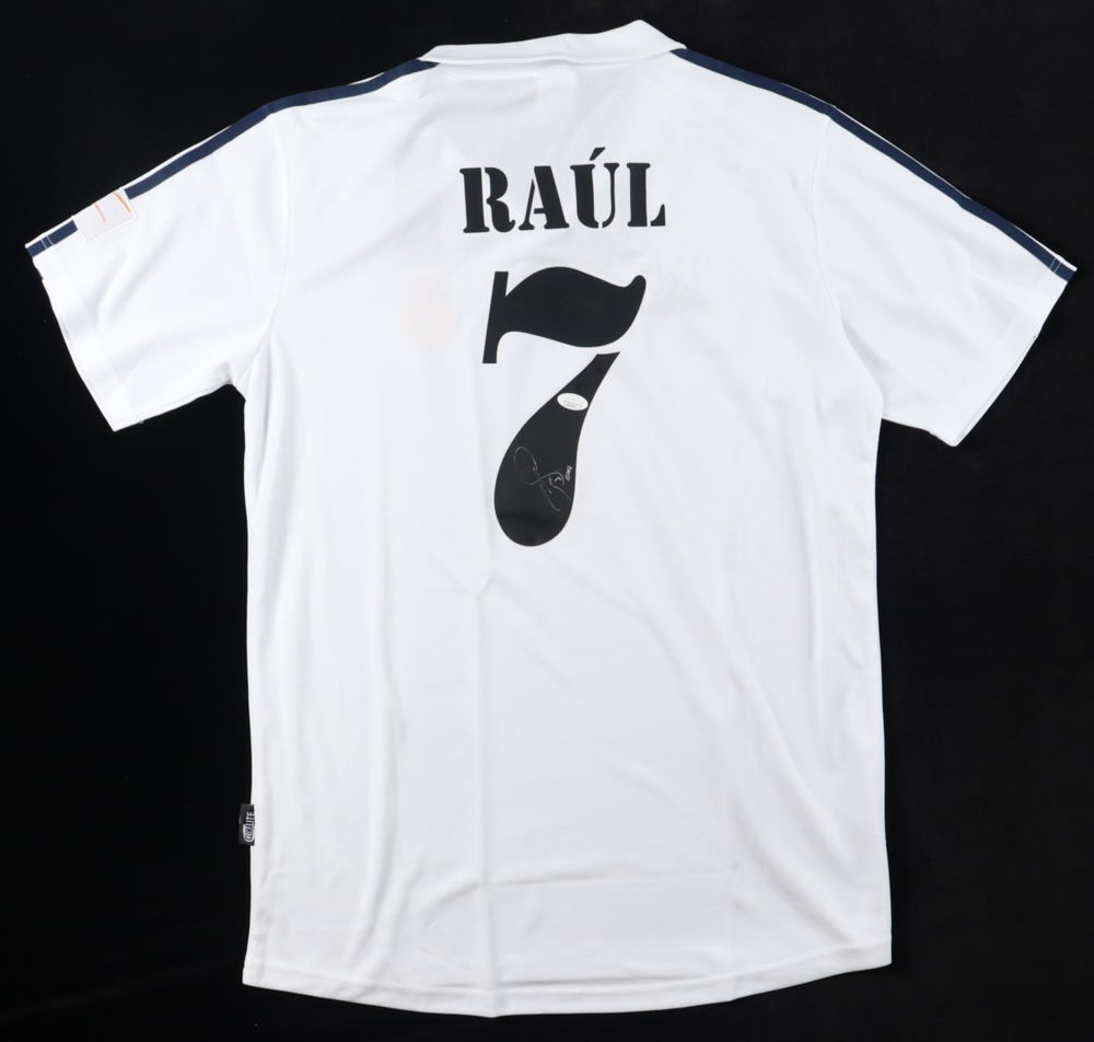 Adidas jersey with everything printed on, size XL. Hand-signed by Raul Gonzalez (Real Madrid).