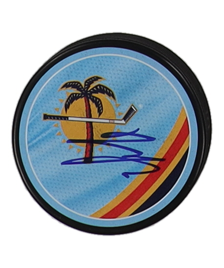 Florida Panthers logo hockey puck has been hand-signed by Aleksander Barkov.